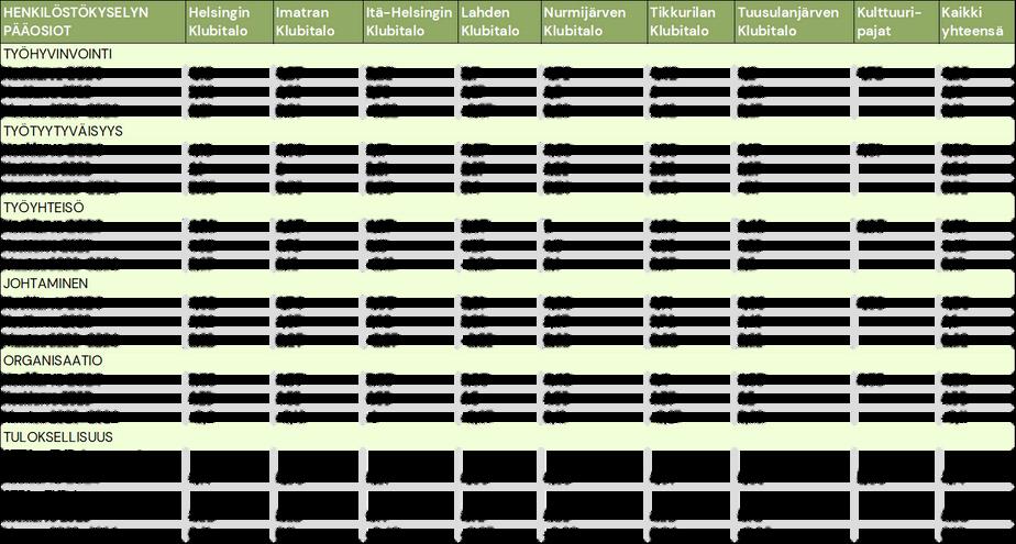 Taulukko 2: Yhdistyksen henkilöstökyselyn tulokset yksiköittäin vuodelta 2024 asteikolla 1-5, jossa 1 on alin ja 5 paras mahdollinen arvosana Kulttuuripajojen osalta ilmoitetaan yhdistetyt tulokset, ei vielä vertailutietoa :