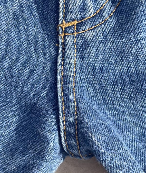 In de broek zie je een duidelijke schuine lijn lopen, dir is de keperbinding. Dit is de sterkste binding en wordt altijd gebruikt voor denimstoffen.