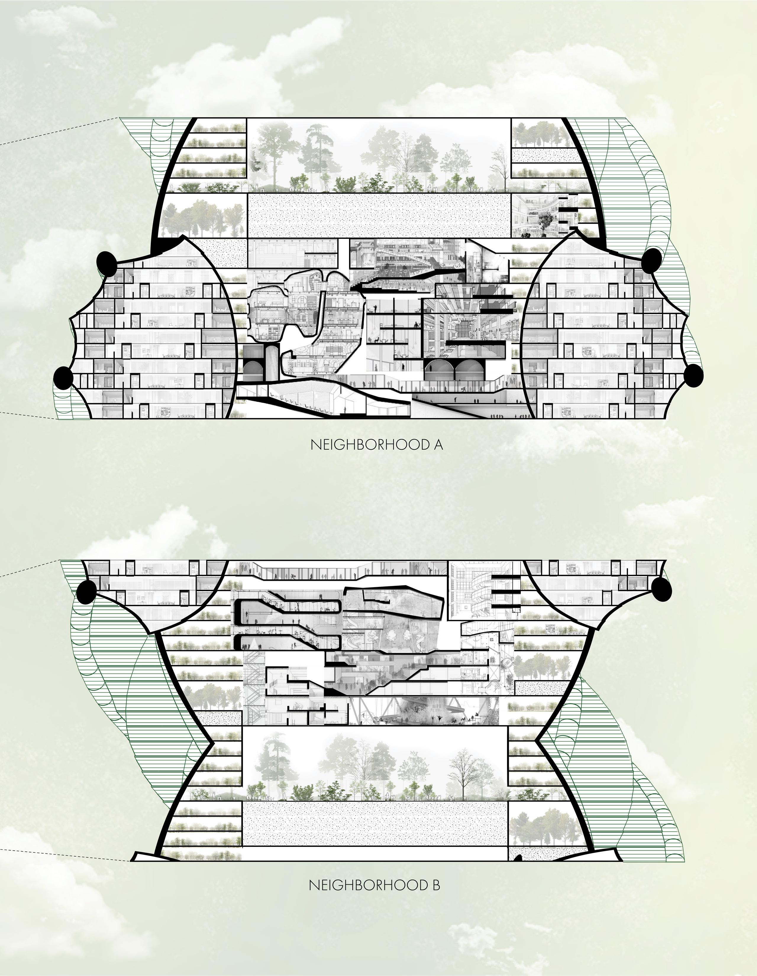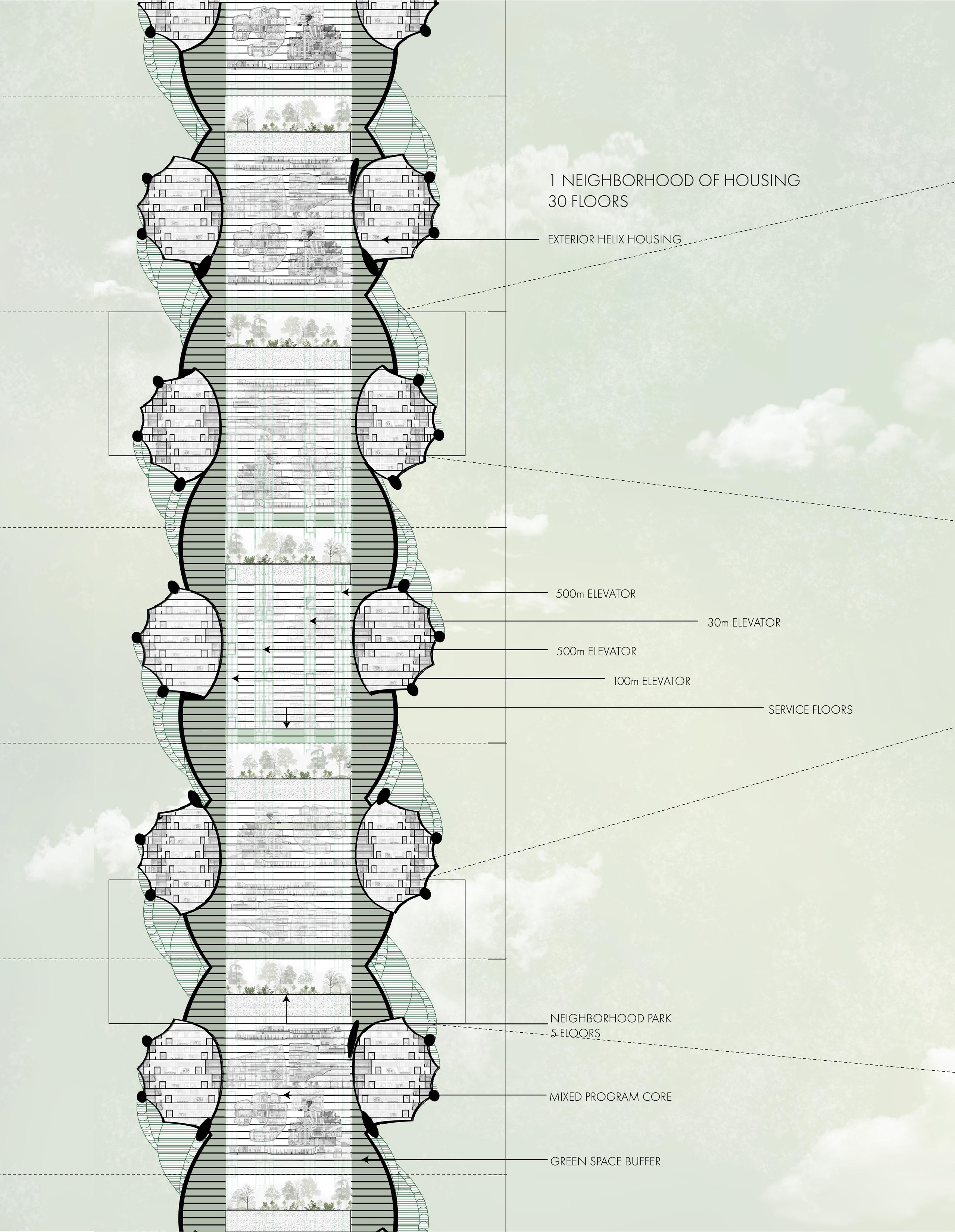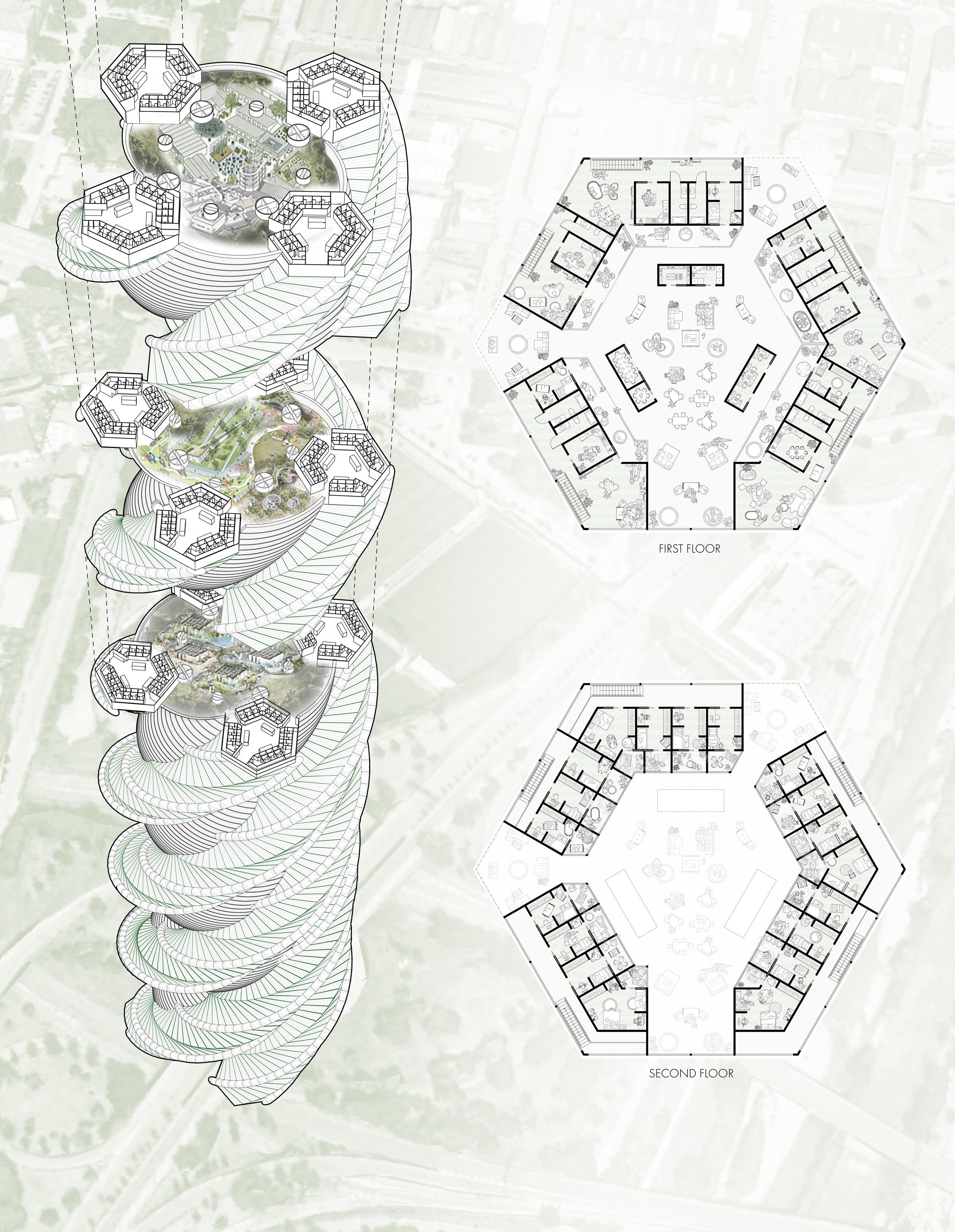 Barcelona currently faces a lack of social housing, with the estimated calculated need being 27 million m2. In the city of Barcelona, this footprint stands to leave a vary lasting mark. In order to reduce this footprint, a vertical city is necessary which builds density in elevation, rather than planimetrically. Located along the Rondas, one of the most important interconnected streets in Barcelona, our skyscraper reaches the height of 512 meters of Tibidabo, the mountain range which caps off Barcelona’s north west access. This vertical city acts as a double helix, with the four exterior helix forms housing co-living townhouse units, which fulfill the social housing need, and the interior helix includes mixed programming and green space. One neighborhood of housing acts as 30 floors, with a range of circulatory distances, programming needs, and green space fulfilment.