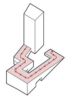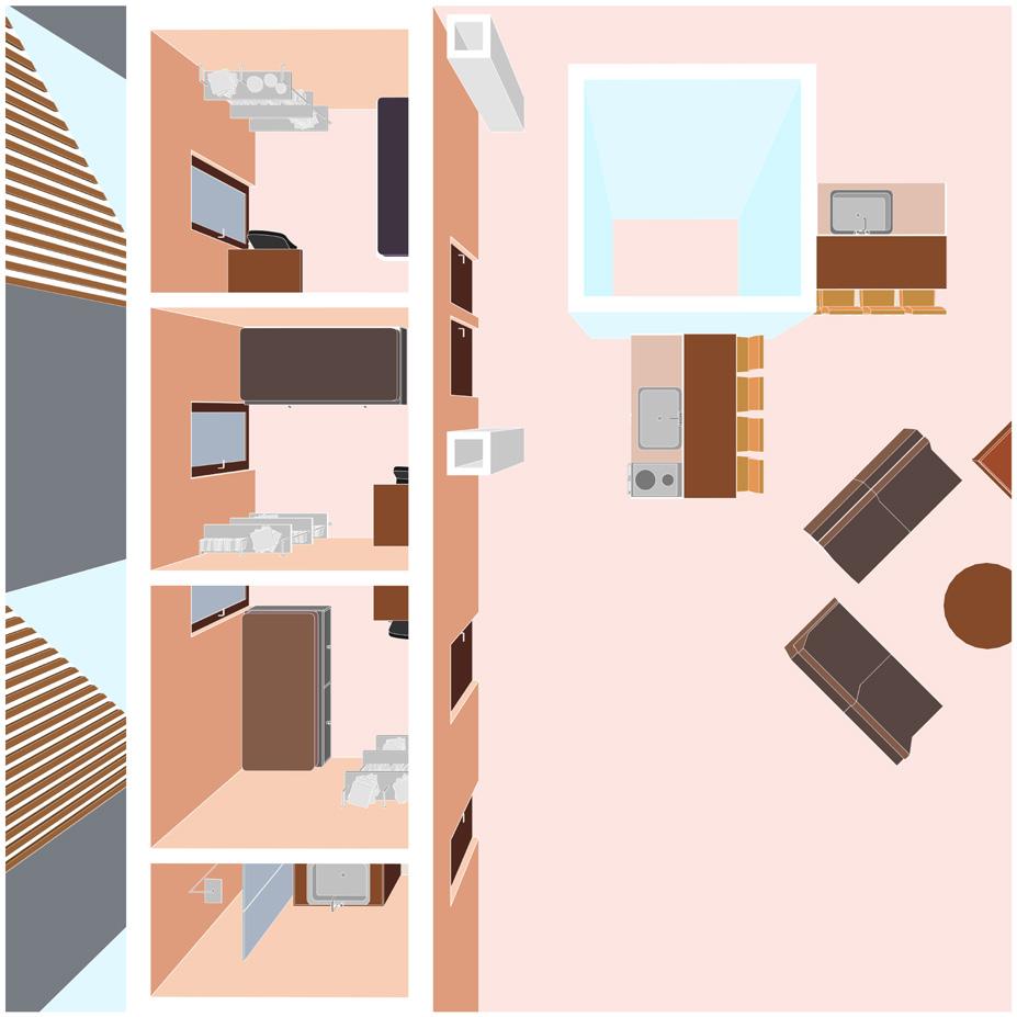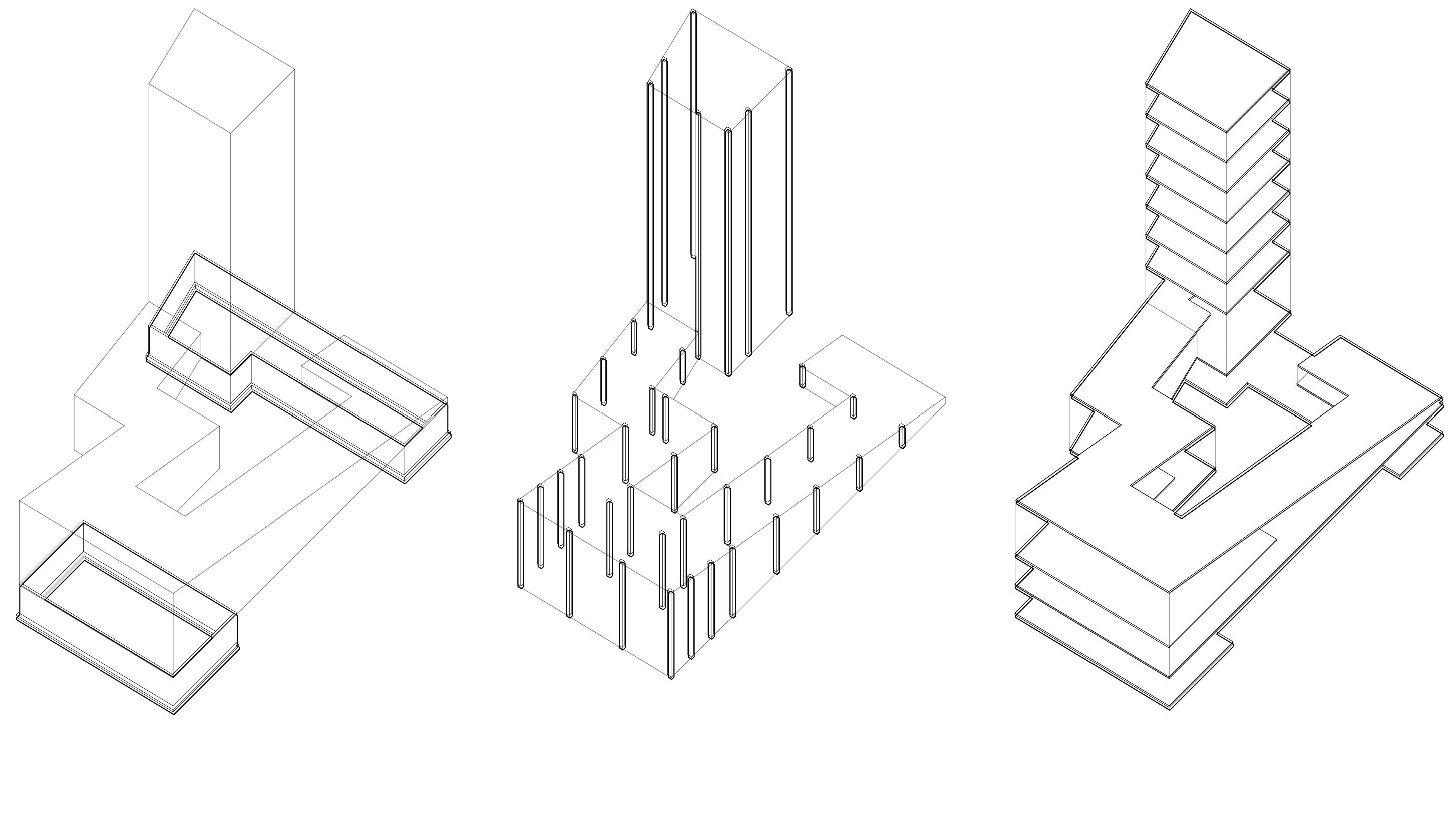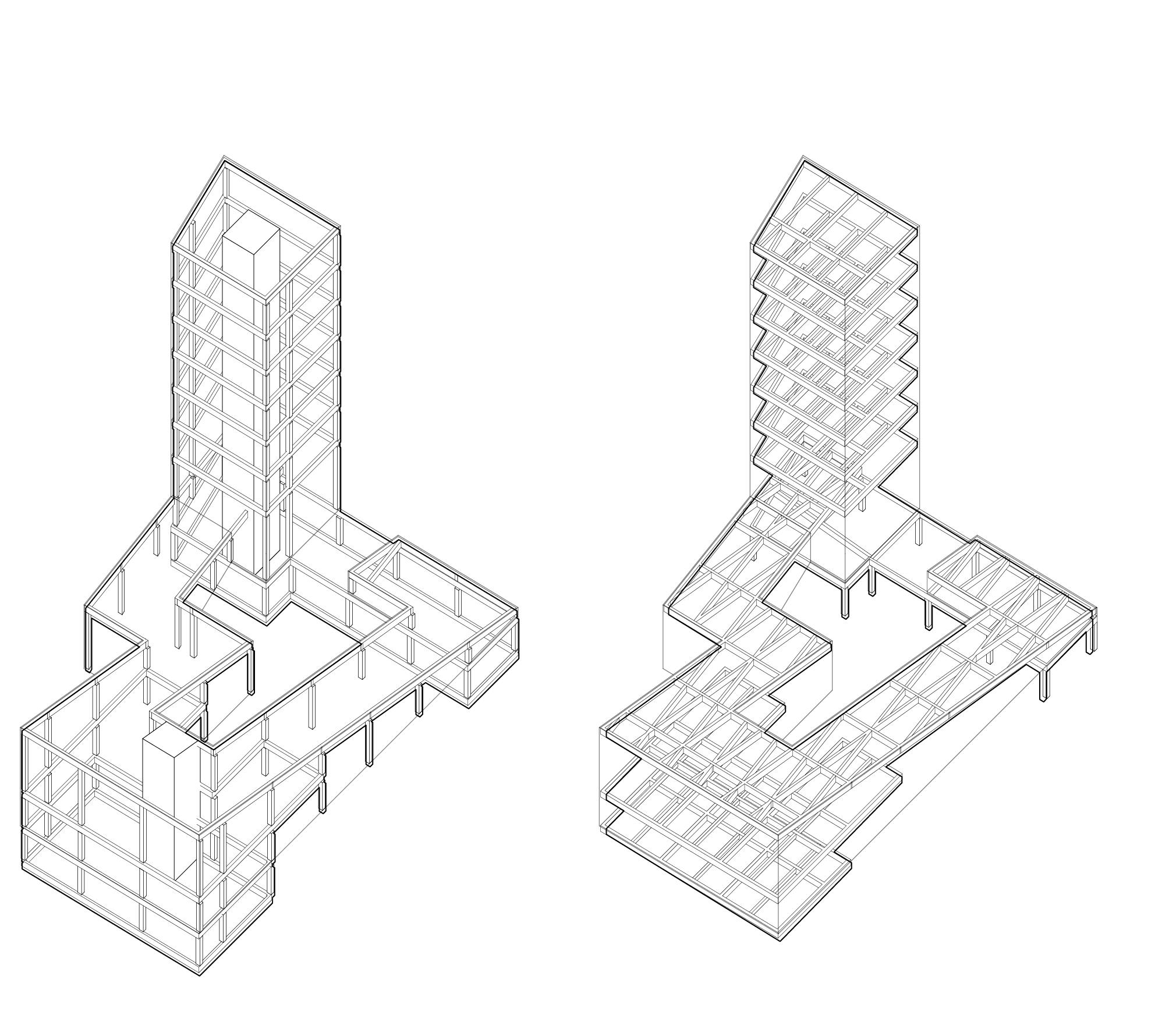 Barcelona currently faces a lack of social housing, with the estimated calculated need being 27 million m2. In the city of Barcelona, this footprint stands to leave a vary lasting mark. In order to reduce this footprint, a vertical city is necessary which builds density in elevation, rather than planimetrically. Located along the Rondas, one of the most important interconnected streets in Barcelona, our skyscraper reaches the height of 512 meters of Tibidabo, the mountain range which caps off Barcelona’s north west access. This vertical city acts as a double helix, with the four exterior helix forms housing co-living townhouse units, which fulfill the social housing need, and the interior helix includes mixed programming and green space. One neighborhood of housing acts as 30 floors, with a range of circulatory distances, programming needs, and green space fulfilment.