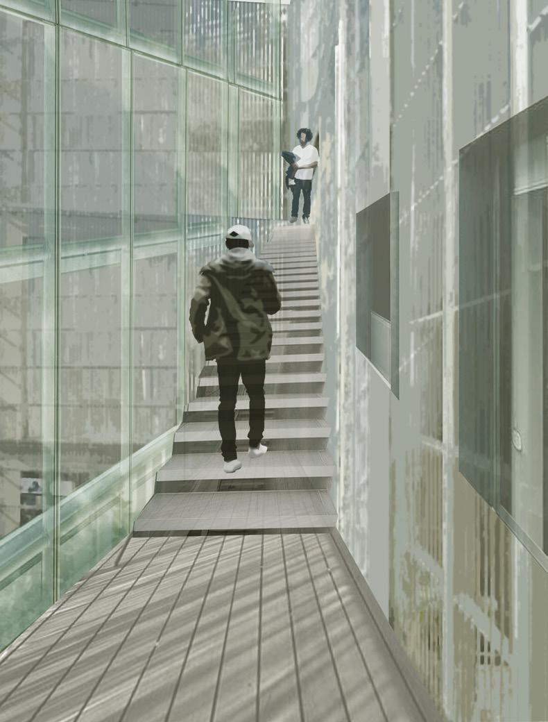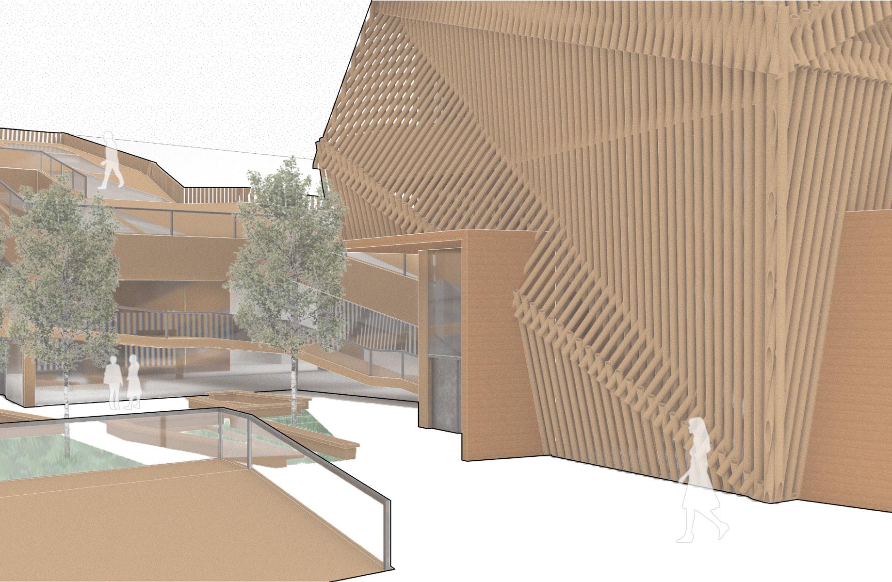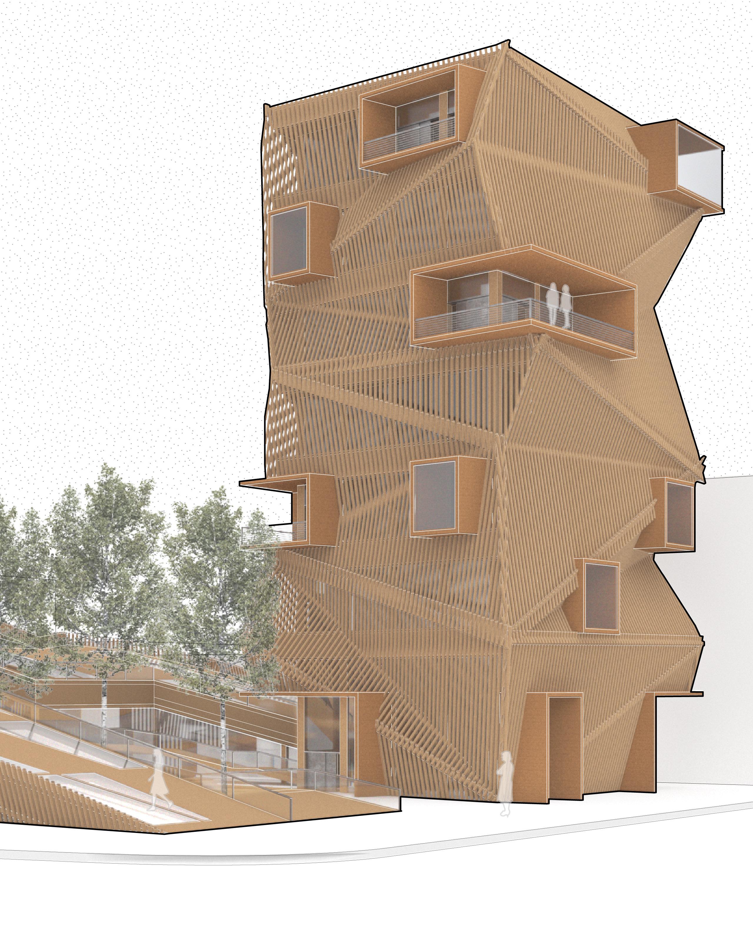 Located in the heart of Chinatown, this social justice research center provides valuable services to the community, such as office spaces, meeting rooms, an indoor workout facility, and an exterior running track. The facade system features bamboo, a symbol of oriental beauty in traditional Chinese culture. Used as scaffolding for modern construction in China, bamboo is lightweight, sustainable, and cheaper to source than most traditionally used building materials. The facade tessellates itself in response to the programmatic features of the building, offering moments of exterior interaction and sunlight infiltration through the cantilevered punch outs. The structural system is comprised of CLT to further accentuate the facade qualities, as well as, provide flexibility to the building’s interior organization.