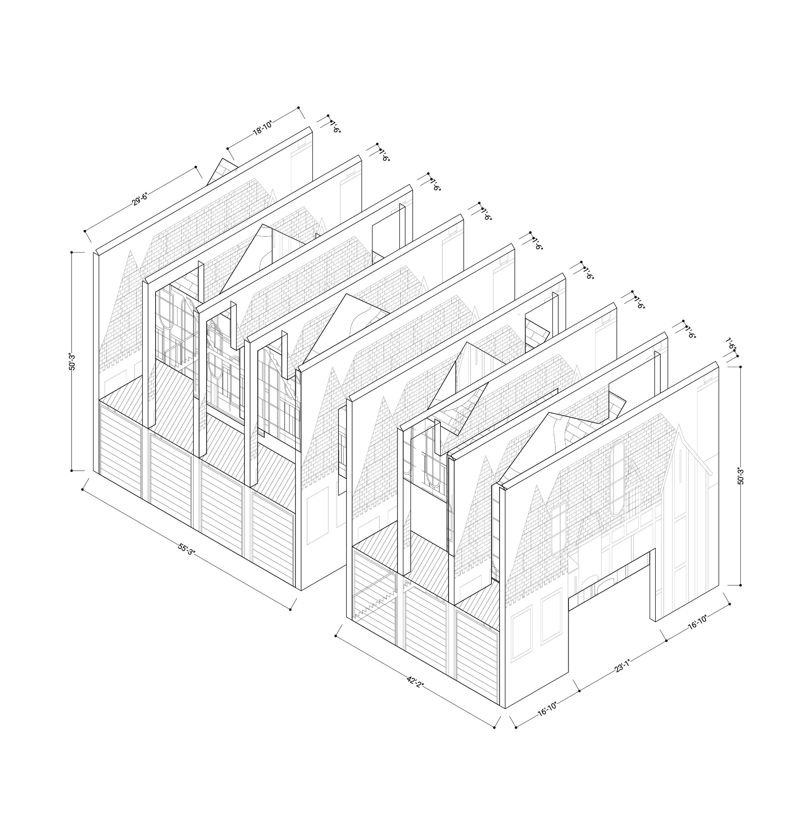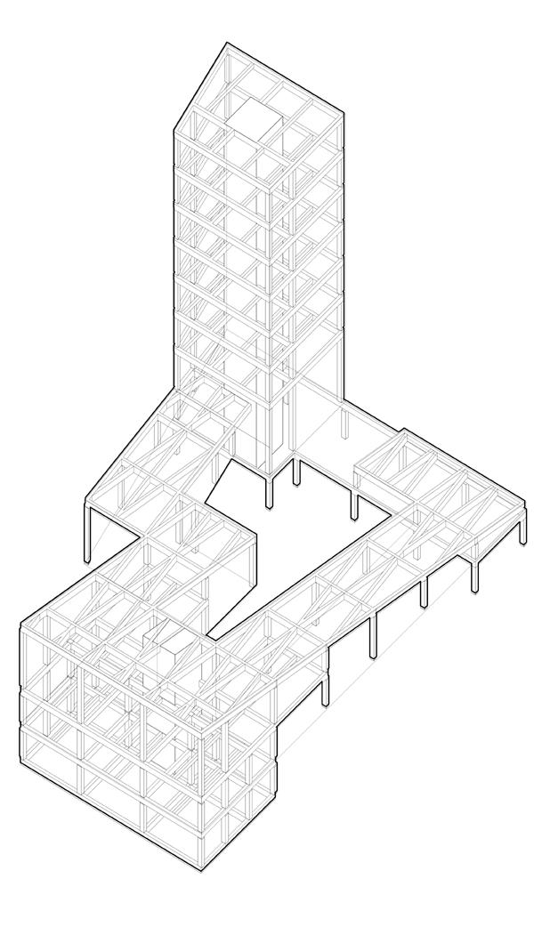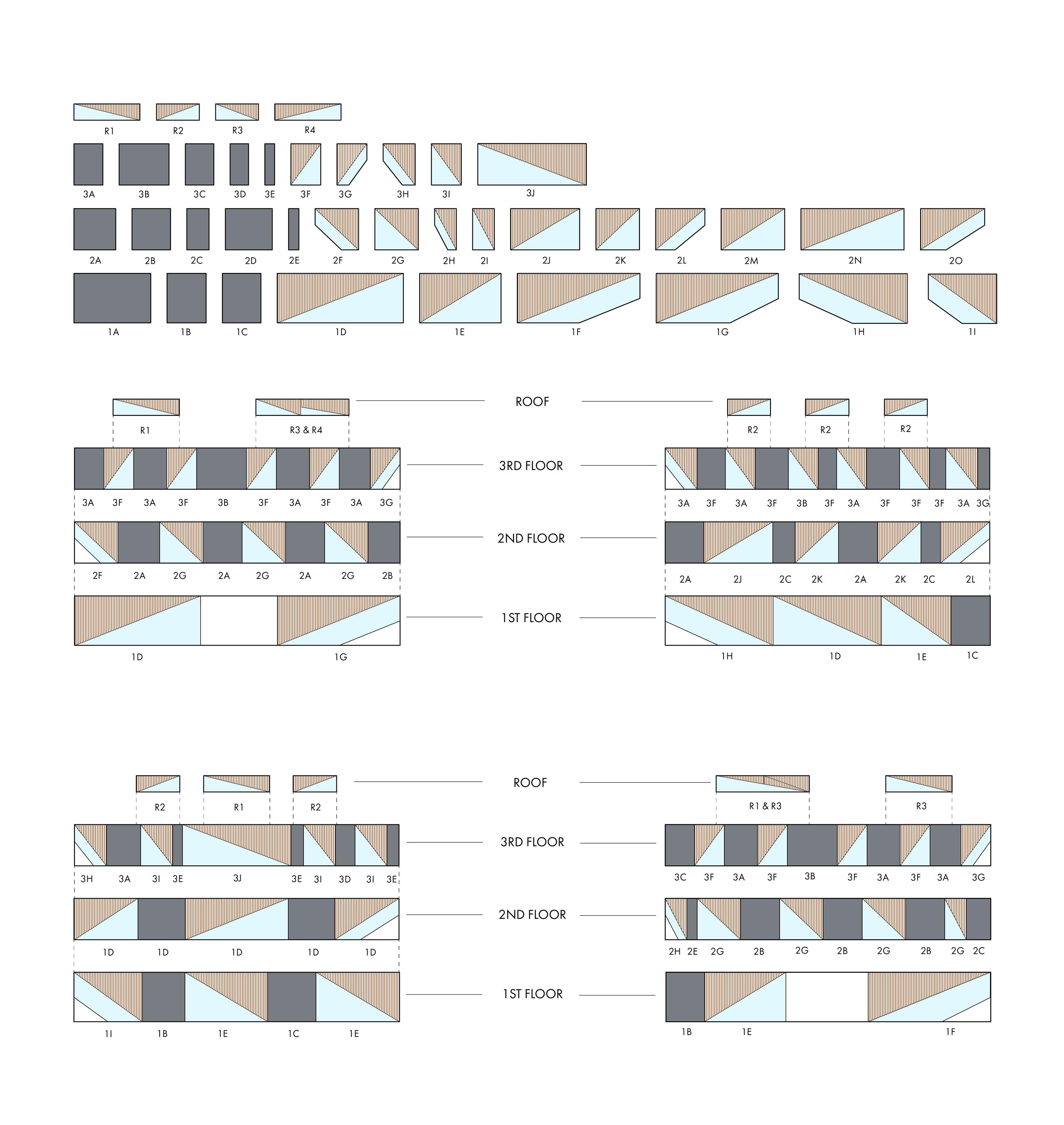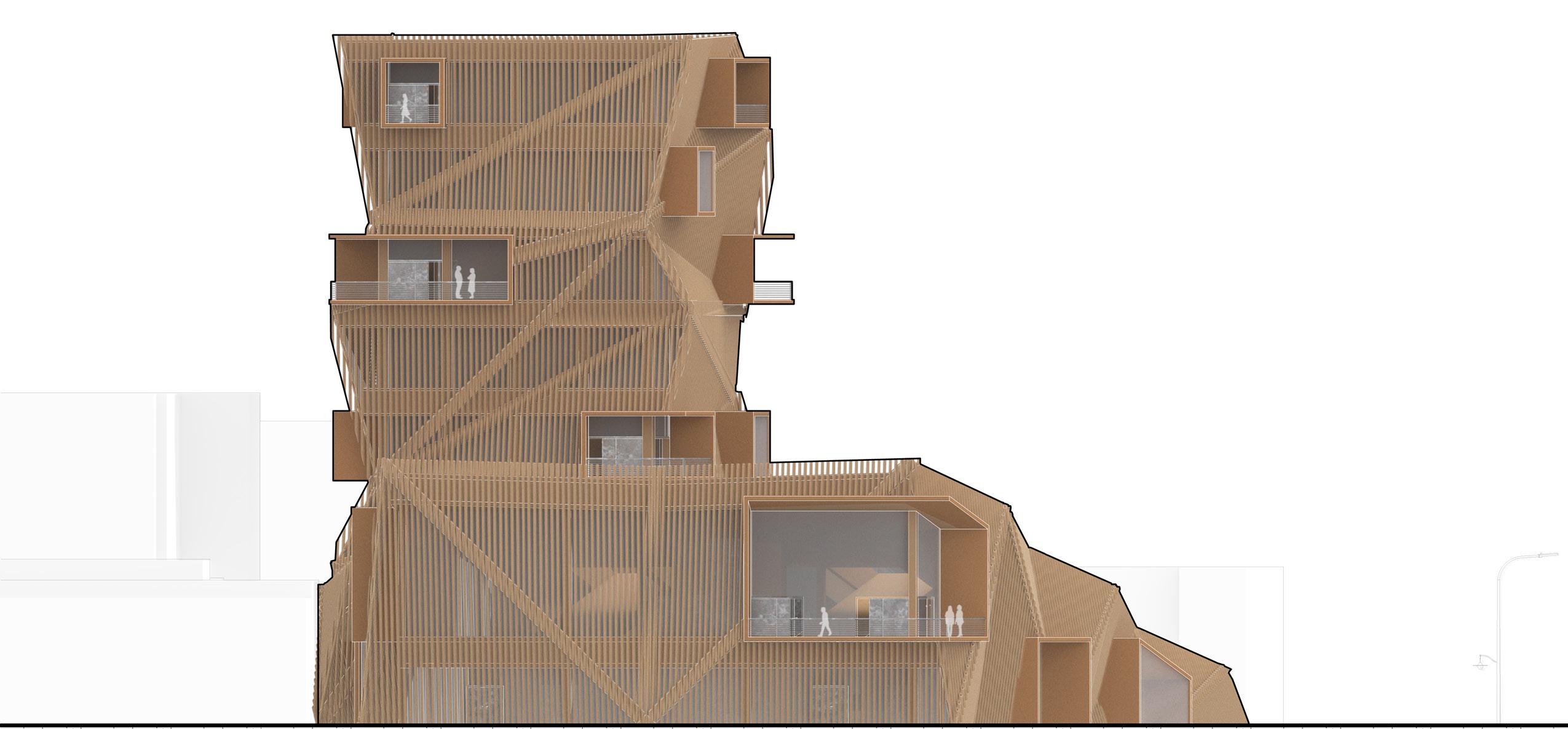 Located in the heart of Chinatown, this social justice research center provides valuable services to the community, such as office spaces, meeting rooms, an indoor workout facility, and an exterior running track. The facade system features bamboo, a symbol of oriental beauty in traditional Chinese culture. Used as scaffolding for modern construction in China, bamboo is lightweight, sustainable, and cheaper to source than most traditionally used building materials. The facade tessellates itself in response to the programmatic features of the building, offering moments of exterior interaction and sunlight infiltration through the cantilevered punch outs. The structural system is comprised of CLT to further accentuate the facade qualities, as well as, provide flexibility to the building’s interior organization.