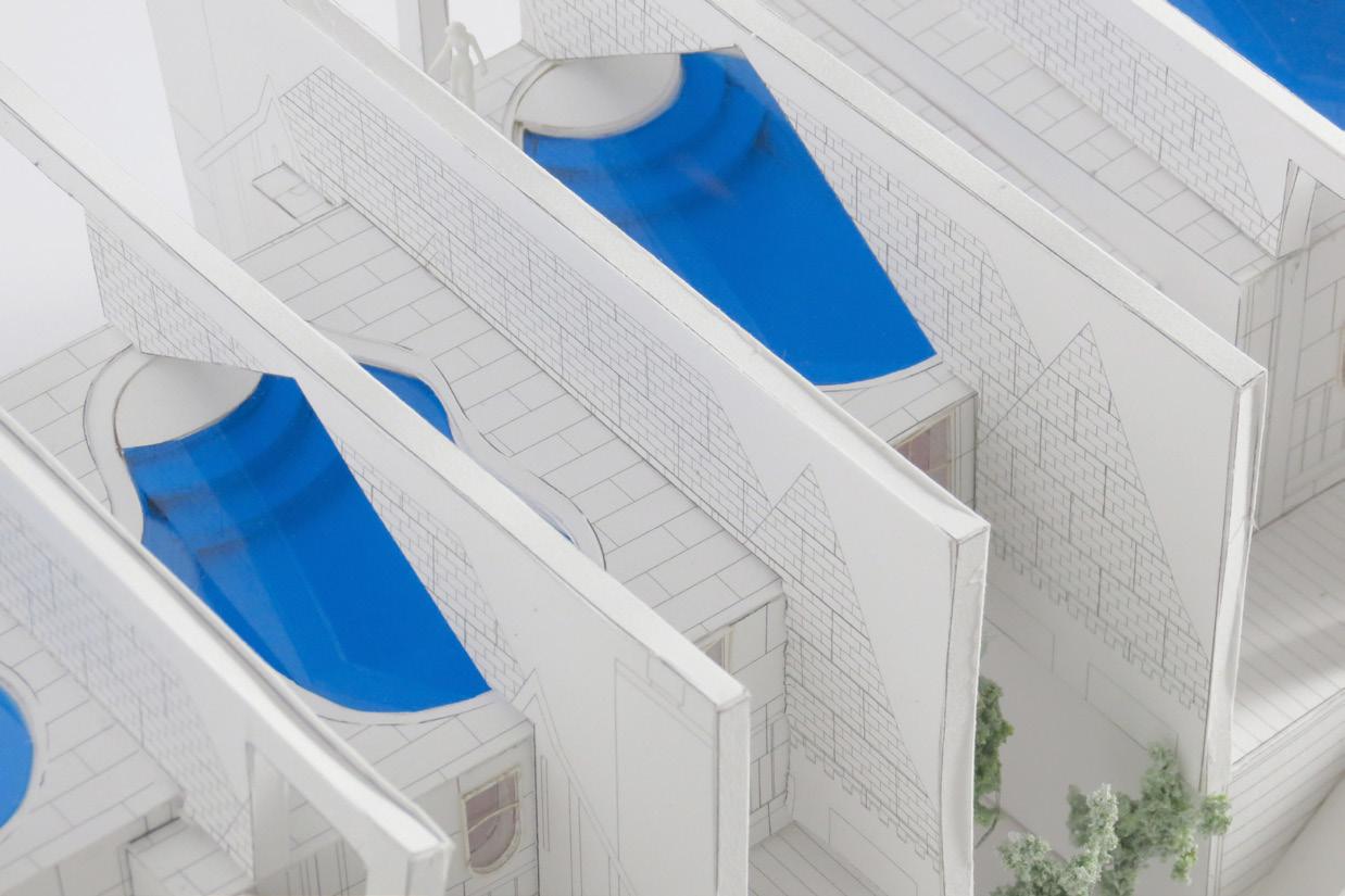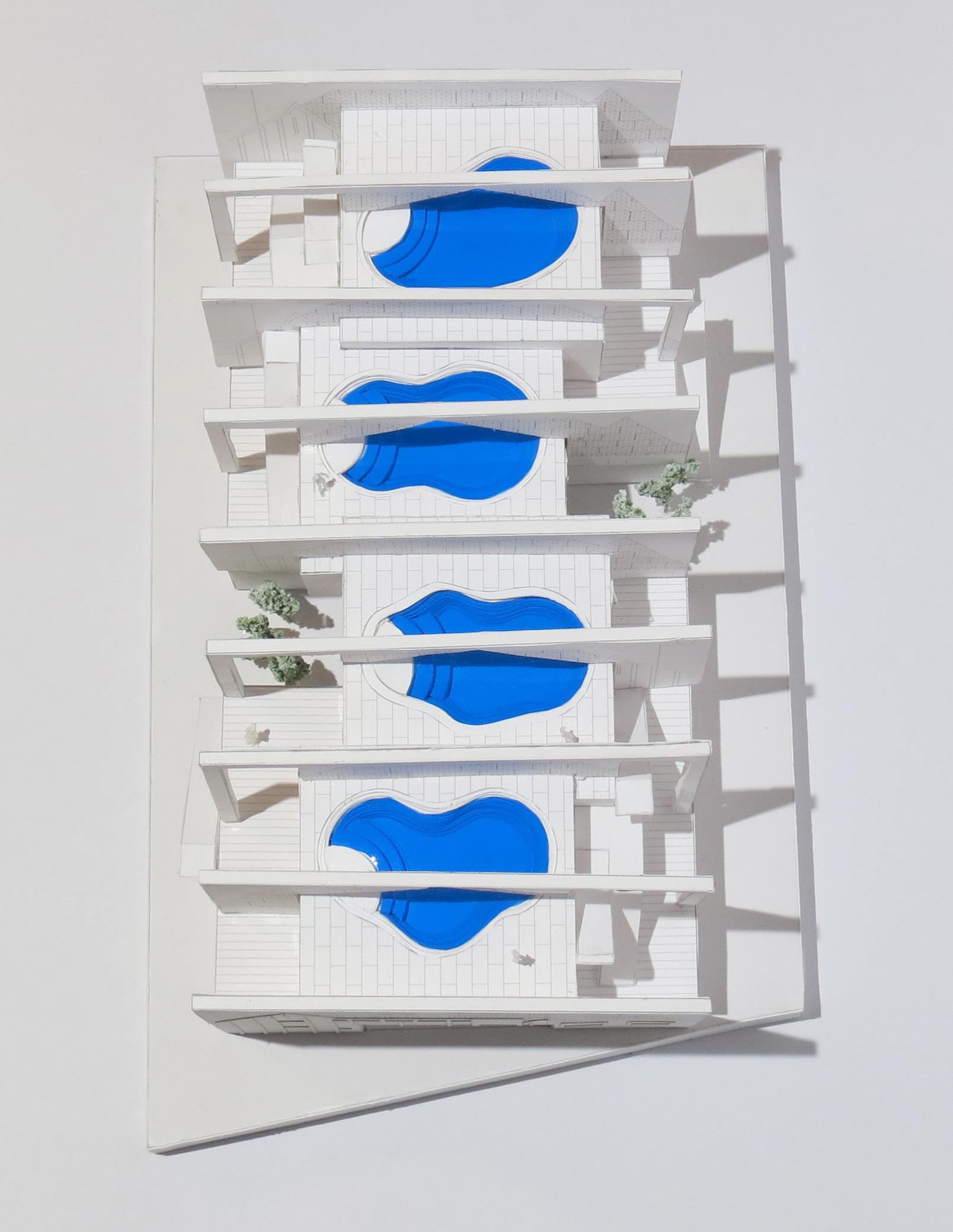 A hidden gem in Los Angeles, Frogtown is an eccentric and unique collection of creatives and multi-generational families. This niche neighborhood offers a respite between the Los Angeles River and the busy downtown districts. Connected primarily by vehicular access, this design proposes a quirky combination of programming meant to fit right into this peculiar pocket of Los Angeles. Through a mixed-use programming of a car wash and four apartment units, this building takes cues from its surroundings in its design and programmatic placement. In a cross-mixing of the average car wash and storybook house found in Frogtown and its surrounding neighborhoods, the facade design appears entirely as a car wash from one vantage point and entirely as a storybook house from another. The perpendicular billboards representing one side of the facade pierce through the massing and contrast with the organic shape of the pools.