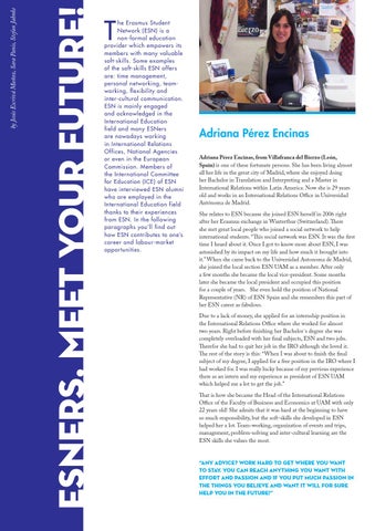 Adriana Pérez Encinas Adriana Pérez Encinas, from Villafranca del Bierzo (León, Spain) is one of these fortunate persons. She has been living almost all her life in the great city of Madrid, where she enjoyed doing her Bachelor in Translation and Interpreting and a Master in International Relations within Latin America. Now she is 29 years old and works in an International Relations Office in Universidad Autónoma de Madrid. She relates to ESN because she joined ESN herself in 2006 right after her Erasmus exchange in Winterthur (Switzerland). There she met great local people who joined a social network to help international students. “This social network was ESN. It was the first time I heard about it. Once I got to know more about ESN, I was astonished by its impact on my life and how much it brought into it.” When she came back to the Universidad Autonoma de Madrid, she joined the local section ESN UAM as a member. After only a few months she became the local vice-president. Some months later she became the local president and occupied this position for a couple of years. She even hold the position of National Representative (NR) of ESN Spain and she remembers this part of her ESN career as fabulous. Due to a lack of money, she applied for an internship position in the International Relations Office where she worked for almost two years. Right before finishing her Bachelor´s degree she was completely overloaded with her final subjects, ESN and two jobs. Therefor she had to quit her job in the IRO although she loved it. The rest of the story is this: “When I was about to finish the final subject of my degree, I applied for a free position in the IRO where I had worked for. I was really lucky because of my previous experience there as an intern and my experience as president of ESN UAM which helped me a lot to get the job.” That is how she became the Head of the International Relations Office of the Faculty of Business and Economics at UAM with only 22 years old! She admits that it was hard at the beginning to have so much responsibility, but the soft-skills she developed in ESN helped her a lot. Team-working, organization of events and trips, management, problem-solving and inter-cultural learning are the ESN skills she values the most. “Any advice? Work hard to get where you want to stay. You can reach anything you want with effort and passion and if you put much passion in the things you believe and want it will for sure help you in the future!”
