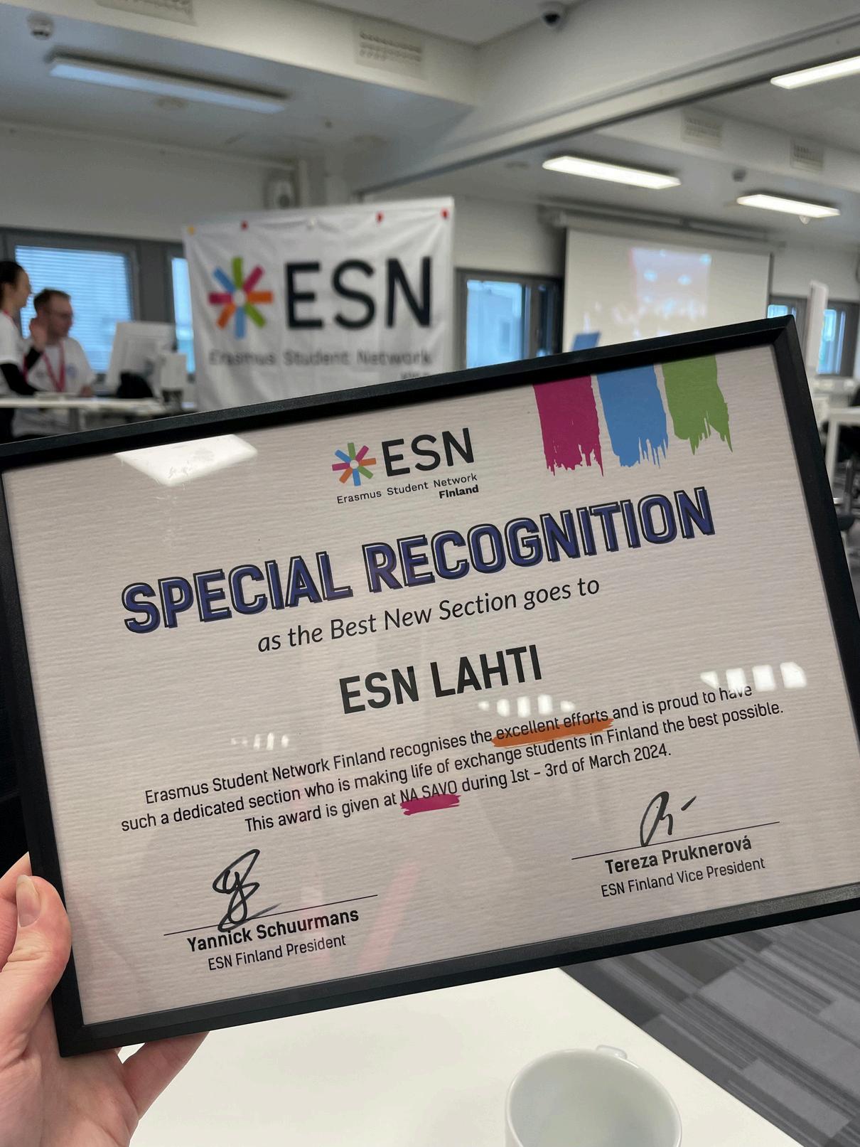 ESN Lahti is the newest section of ESN Finland Exchange students of Lahti ESLA ry was founded in 2023 and we officially became a section and gained the ESN Lahti name in March 2024 During Savo National Assembly.