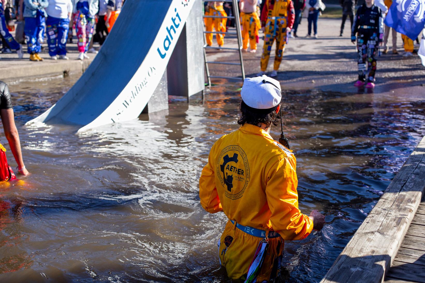 Overalls are not meant to be washed; stains and marks are part of the student overalls' character However, it is accepted to wash them by swimming in the Lake Vesijärvi while wearing them