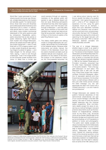 could perceive through an eyepiece, members of the general public still wanted to see a celestial object with their own eyes. Workshop participants remarked how they often heard gasps when visitors took their first-ever look through a telescope — and that years later, some members of the public still recollect how inspired and awe-struck they felt at personally viewing the rings of Saturn or the moons of Jupiter or the pale Ring Nebula in Lyra. • The clearly visible gears and setting circles of vintage telescopes can concretely demonstrate the fundamentals of the celestial sphere. Because older instruments are wholly manual, the motions of the telescope mount can be used to illustrate concepts such as celestial latitude and longitude, compensation for the rotation of the Earth, the position of the observer’s meridian, etc. One presenter recounted: “As