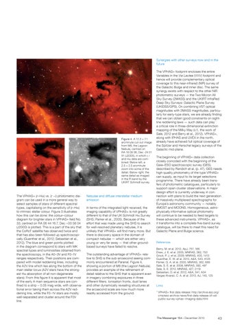 Nebulae and diffuse interstellar medium e mission In terms of the integrated light received, the imaging capability of VPHAS+ is not greatly different to that of the UK Schmidt Hα Survey (SHS; Parker et al., 2005). Because of the effort that was made using the SHS to search for well-resolved planetary nebulae, it is unlikely that VPHAS+ will find many more. But there is discovery space in the domain of compact nebulae — which are either very young or very far away — that other groundbased surveys have failed to resolve. The outstanding advantage of VPHAS+ relative to SHS is the sub-arcsecond seeing commonly encountered at Paranal. Figure 4, showing a portion of M8 (the Lagoon Nebula), provides an example of the refinement of detail relative to the SHS that is apparent even in imagery combining exposures in three different filters. Ionisation fronts, dust lanes and other dynamically revealing structures at the arcsecond scale are now much more readily accessed from the ground.