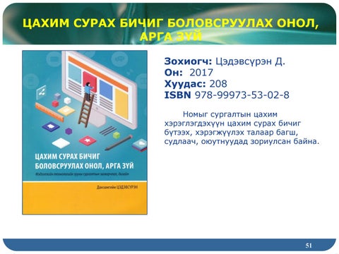ЦАХИМ СУРАХ БИЧИГ БОЛОВСРУУЛАХ ОНОЛ, АРГА ЗҮЙ Зохиогч: Цэдэвсүрэн Д. Он: 2017 Хуудас: 208 ISBN 978-99973-53-02-8 Номыг сургалтын цахим хэрэглэгдэхүүн цахим сурах бичиг бүтээх, хэрэгжүүлэх талаар багш, судлаач, оюутнуудад зориулсан байна.