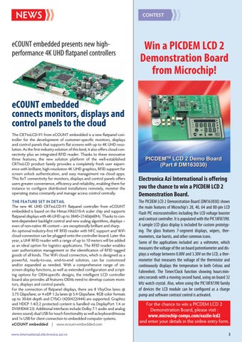 eCOUNT embedded connects monitors, displays and control panels to the cloud The CRTtoLCD-91 from eCOUNT embedded is a new flatpanel controller for the development of customer-specific monitors, displays and control panels that supports flat screens with up to 4K UHD resolution. As the first industry solution of this kind, it also offers cloud connectivity plus an integrated RFID reader. Thanks to these innovative three features, the new solution platform of the well-established CRTtoLCD product family provides a completely fresh user experience with brilliant, high-resolution 4K UHD graphics, RFID support for screen unlock authentication, and easy management via cloud apps. This IIoT connectivity for monitors, displays and control panels offers users greater convenience, efficiency and reliability, enabling them for instance to configure distributed installations remotely, monitor the operating status constantly and manage access control centrally. ThE fEaTurE SET iN dETail The new 4K UHD CRTtoLCD-91 flatpanel controller from eCOUNT embedded is based on the Himax HX6310-A scaler chip and supports flatpanel displays with 4K-UHD up to 3840×2160@60Hz. Thanks to content-dependent backlight control and new scaling algorithms, displays – even of non-native 4K content – are exceptionally brilliant and sharp. An optional industry-first HF RFID reader with NFC support and WiFi cloud connection can be plugged onto the controller board. Later this year, a UHF RFID reader with a range of up to 10 meters will be added as an ideal option for logistics applications. The RFID reader enables user authorization management or the identification of RFID tagged goods of all kinds. The WiFi cloud connection, which is designed as a powerful, ready-to-use, end-to-end solution, can be customized and/or expanded as needed. With a comprehensive range of onscreen display functions, as well as extended configuration and scripting options for OEM-specific designs, the intelligent LCD controller board also provides all features OEMs need to develop custom monitors, displays and control panels. For the connection of flatpanel displays, there are 8 VbyOne lanes @ 3.75 Gbps/lane, or 4 eDP 1.2a lanes @ 5.4 Gbps/lane. RGB color formats up to 30-bit depth and CYbCr (420/422/444) are supported. Graphics and HDCP 1.4/2.2 protected content is handled via DisplayPort 1.4 or DVI/HDMI 2.0. Additional interfaces include Dolby 7.1 audio and analog stereo sound, dual USB for touch functionality as well as keyboard/mouse and 1x USB for client connection to embedded computer systems. eCOuNT embedded | www.ecount-embedded.com www.international.electronica-azi.ro