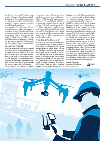 fact, this has conversely led to the curious trend of ‘military spec’ standards, originally developed for the armed forces, migrating into the consumer and commercial markets, because they are seen as a strong guarantee of reliability and ruggedness. Unfortunately, the proliferation of consumer electronics in military applications is opening up potential vulnerabilities. The use of consumer-grade hardware and services to handle secure data – sometimes even in breach of official rules or guidelines – has been blamed for several damaging information leaks, among them US officials’ emails and US intelligence services’ hacking tools. ASYMMETRIC THREATS In general, it can be argued that the spread of cheap, powerful, mass-produced technology has, in some areas, tended to tilt the balance of power away from large organisations, such as armies and government agencies. The very nature of this imbalance lends itself to one of a modern military’s greatest fears: asymmetric warfare, or low cost attacks that generate enormously costly damage. These concerns are driving increasing