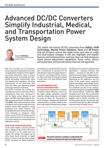 This article will feature DC/DC converters from Bellnix, HVM Technology, Murata Power Solutions, Vicor and XP Power that are compact, ensure low ripple noise, and cater to single and dual-output voltages. It will also highlight and explain features and enhancements, and how they can help designers boost power adjustment capabilities, lower noise, ensure self-protection, and provide better thermal management. non-isolated. An isolated DC/DC converter uses a transformer to eliminate the DC path between input and output (Figure 1). In contrast, non-isolated DC/DC converters, often used when the change in voltage is small, have a DC path between input and output. KEY PERFORMANCE AND DESIGN CONSIDERATIONS Key performance characteristics of DC/DC converters include efficiency, current rating, ripple voltage, regulation, transient response, voltage rating, size, and weight. For more on these, see “Introduction to DC/DC converters.” Designers also need to be concerned with a converter’s ability to support a wide range of nominal input voltages.