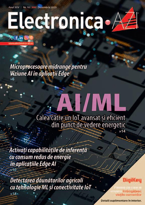 Numărul 300: Privind spre viitorul tehnologiei și al revistei Încheiem anul cu o ediție specială – cea cu numărul 300 – un moment important pentru Electronica Azi și pentru comunitatea tehnică pe care o servim de peste două decenii. Iar tema centrală a acestei ediții nu putea fi alta decât una dintre cele mai dinamice direcții din prezent: Edge AI, învățarea automată distribuită și viziunea artificială. Articolele incluse în acest număr explorează evoluțiile accelerate din zona sistemelor embedded inteligente. De la microprocesoarele midrange optimizate pentru viziune AI și până la soluțiile ultra-eficiente pentru inferență la marginea rețelei, observăm cum algoritmii devin din ce în ce mai integrați în dispozitive compacte, alimentate uneori doar din baterii. Analiza dedicată IoT-ului avansat arată cum AI și ML transformă modul în care senzorii comunică, se trezesc, se calibrează și iau decizii local, reducând masiv consumul energetic. În plus, aplicațiile practice – precum detectarea dăunătorilor agricoli cu ajutorul camerelor inteligente –demonstrează că tehnologia devine accesibilă, scalabilă și profund utilă în domenii tot mai diverse.