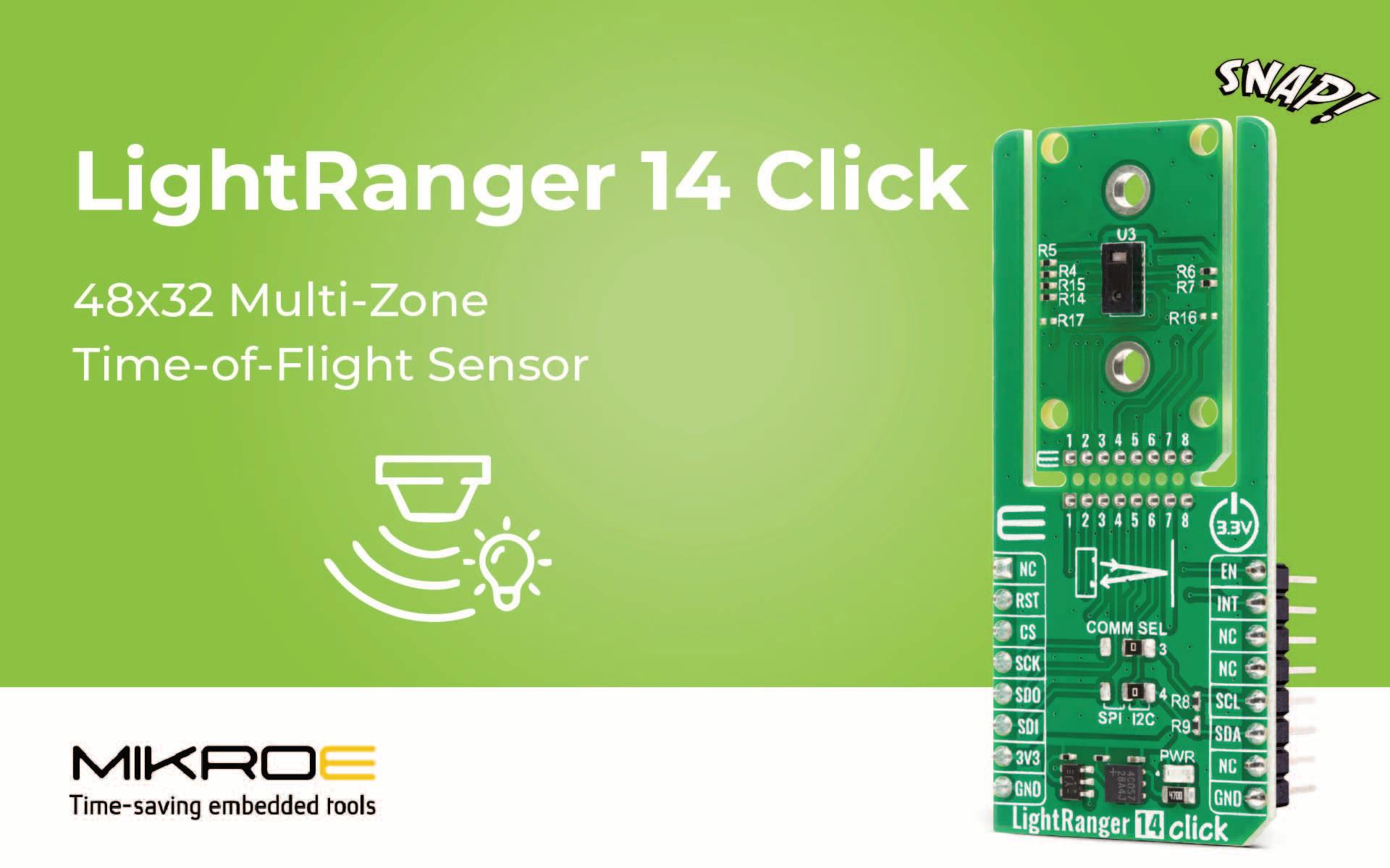 LightRanger 14 Click is a new optical sensor Click board™ from MIKROE, the embedded solutions company that dramatically cuts development time by providing innovative hardware and software products based on proven standards. The compact Click add-on boards enable developers
