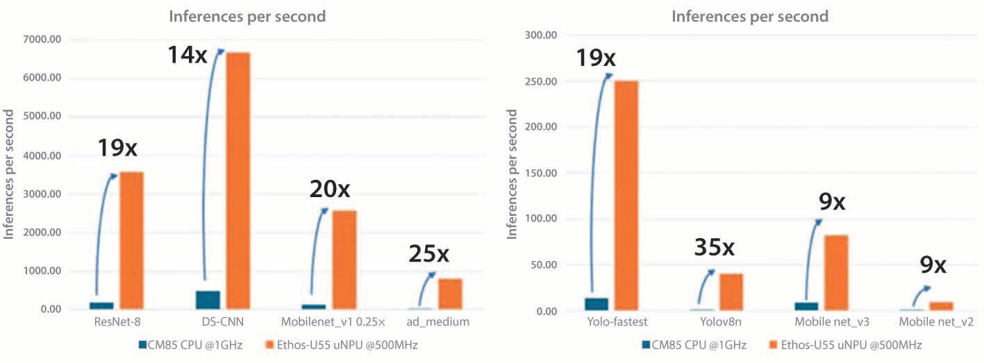 Acestea combină nucleele CPU Arm® Cortex® -M85 (CM85) și Cortex-M33 (CM33), de înaltă performanță, cu procesorul de rețea neurală (NPU) Arm Ethos™-U55, pentru a oferi o creștere semnificativă a performanței în AI/ML, DSP și procesare scalară – o configurație ideală pentru aplicații Edge AI și IoT.