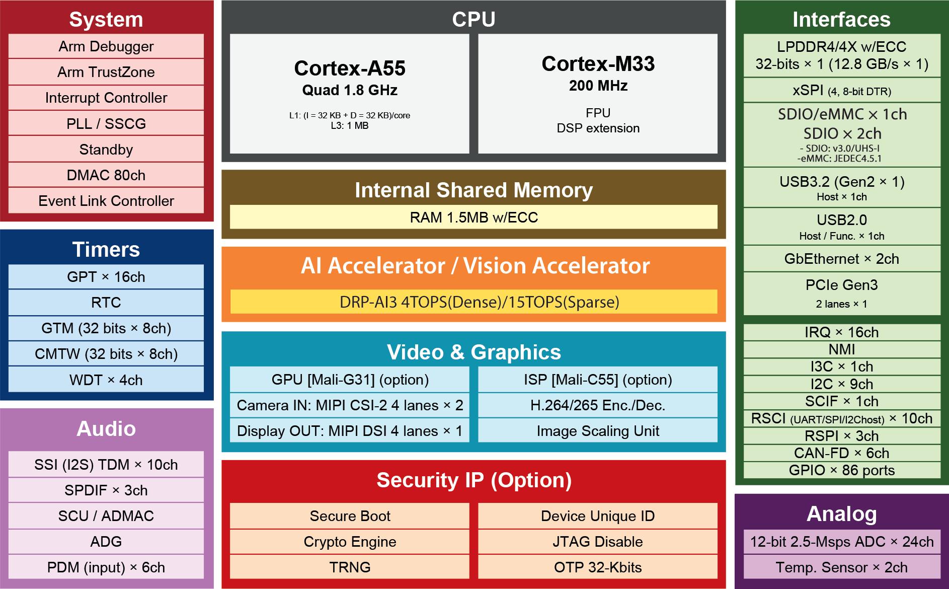 • Accelerator AI: Motorul AI dedicat DRPAI3 de la Renesas permite procesarea rapidă a inferenței, oferind consum energetic redus și flexibilitatea necesară pentru dispozitivele finale (endpoints).