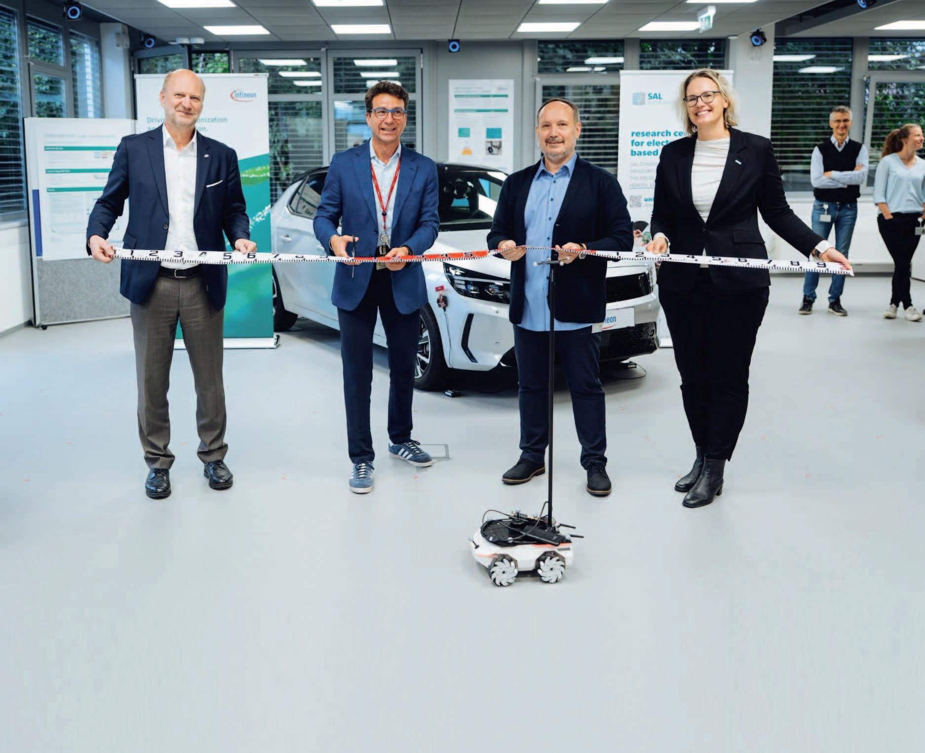 Infineon UWB Lab Graz Opening: Stefan Rohringer (Country R&D Officer Infineon Austria), Maurizio Skerlj (Senior Vice President und Product Line Manager Authentication & Identity Solutions Connected Secure Systems Infineon), Harald Witschnig (Project lead UWB Lab Graz, Infineon Austria), Christina Hirschl (CEO Silicon Austria Labs)