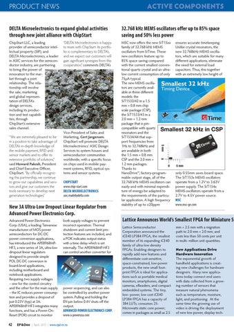 Lattice Announces World’s Smallest FPGA for Miniature Sy Lattice Semiconductor Corporation announced the iCE40 LP384 FPGA, the smallest member of its expanding iCE40 family of ultra-low density FPGAs. Enabling designers to rapidly add new features and differentiate cost-sensitive, space-constrained, low-power products, the new small footprint FPGA is ideal for applications such as portable medical monitors, smartphones, digital cameras, eReaders, and compact embedded systems. The tiny, low- power, low cost iCE40 LP384 FPGA has a capacity of 384 LUTs; consumes 25Microwatts static core power; comes in packages as small as 2.5