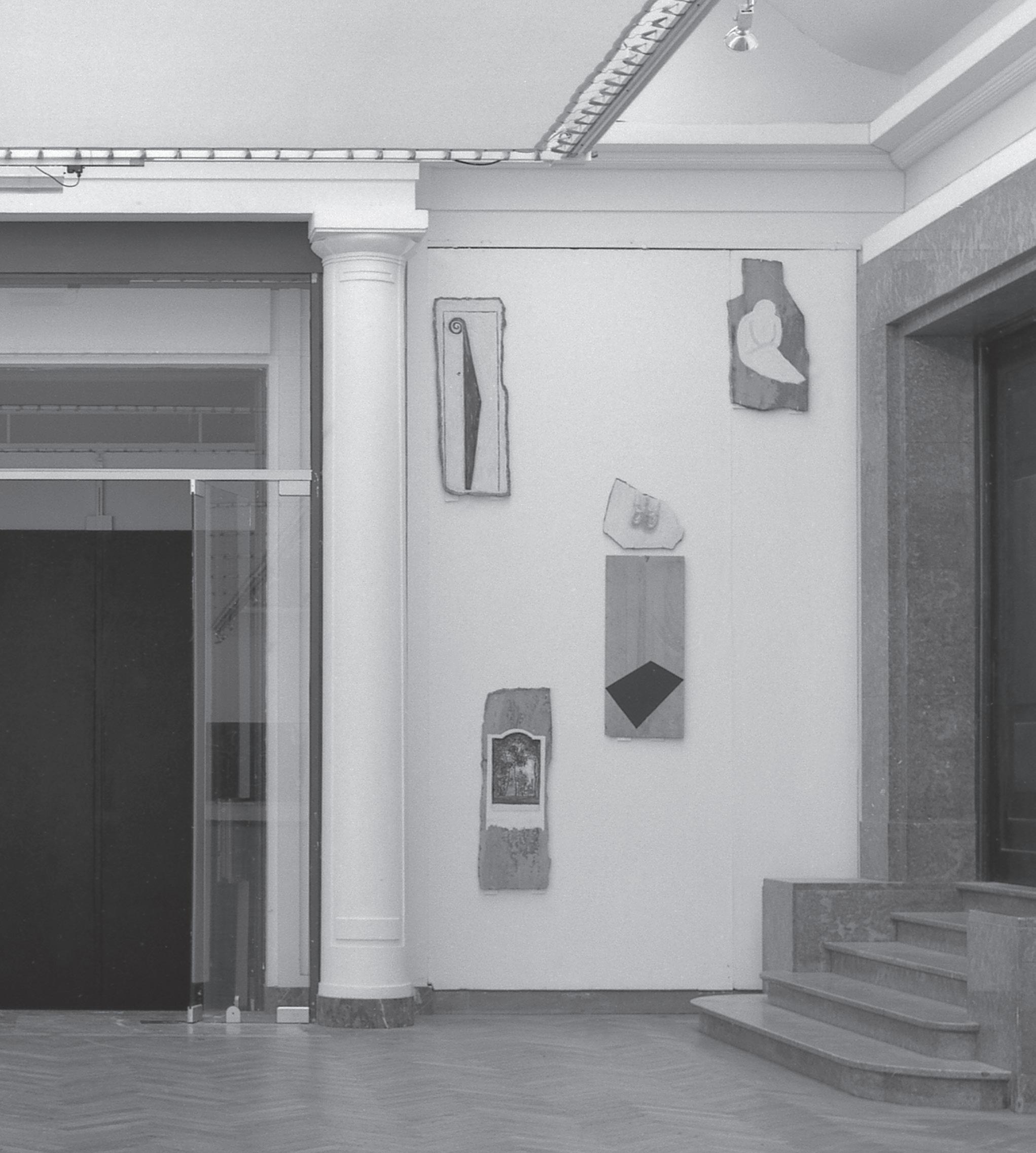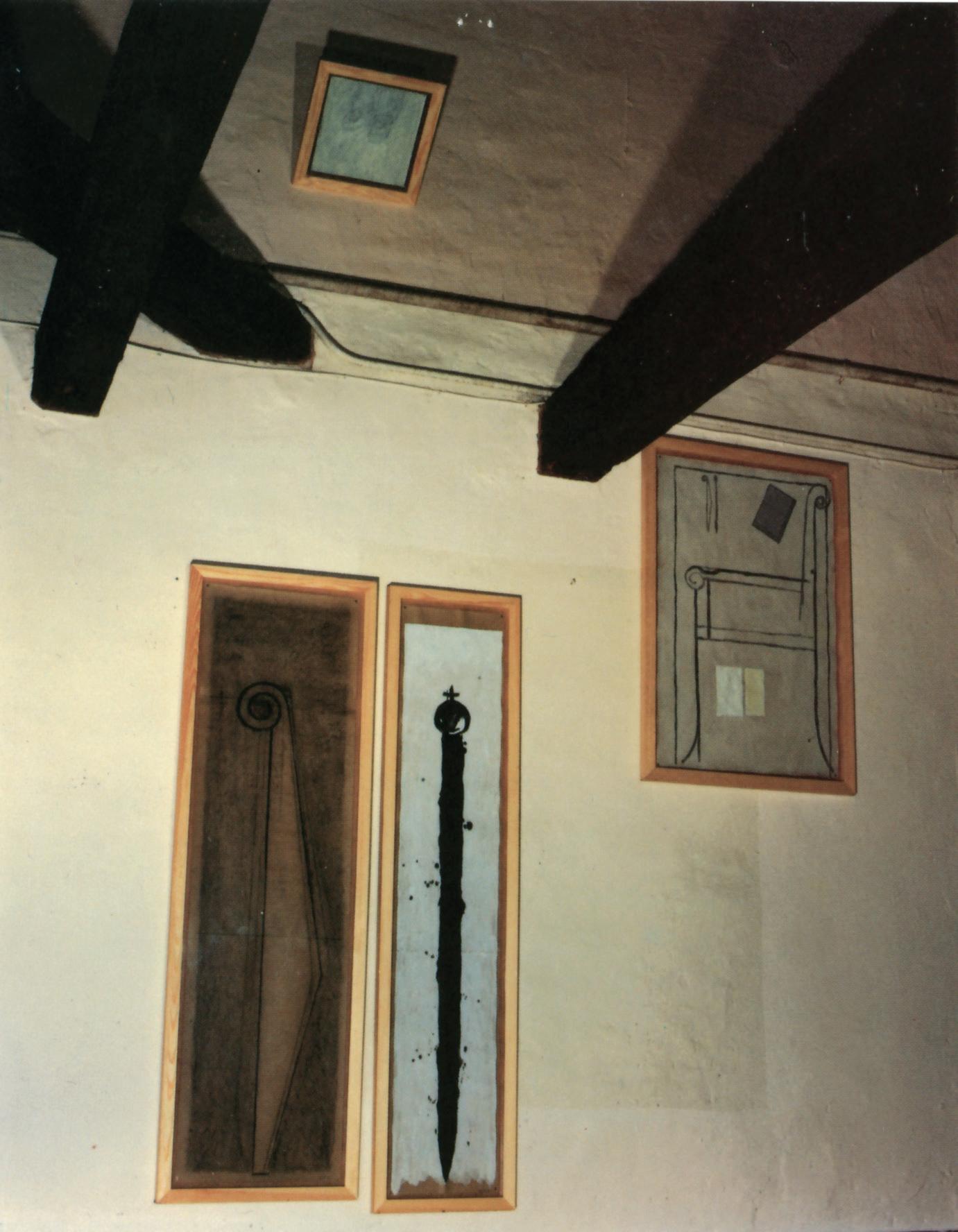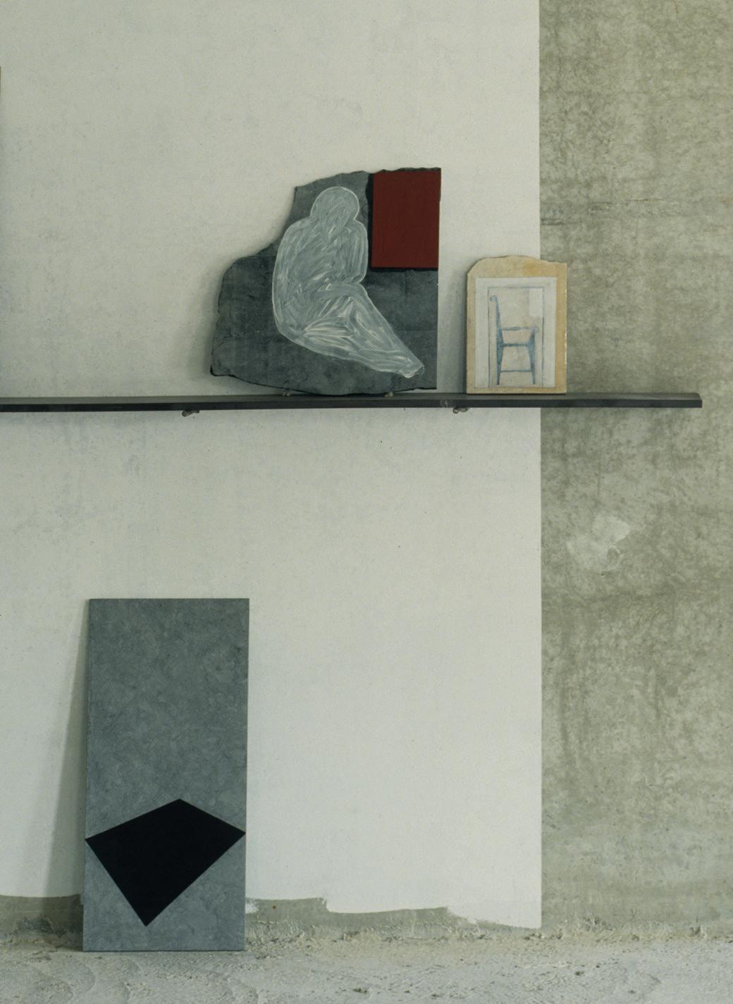 Sans titre, 1988. Pierre de Marne, verre à vin. Pieds, 1985-86. Huile sur bâche, acrylique sur carton. Mnêmê, 1985. Acrylique sur photo et carton. Belgicisme – objets dard, 1988. Casa Frollo, Venezia.