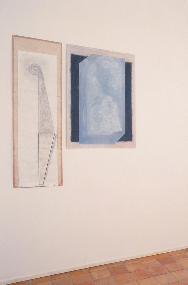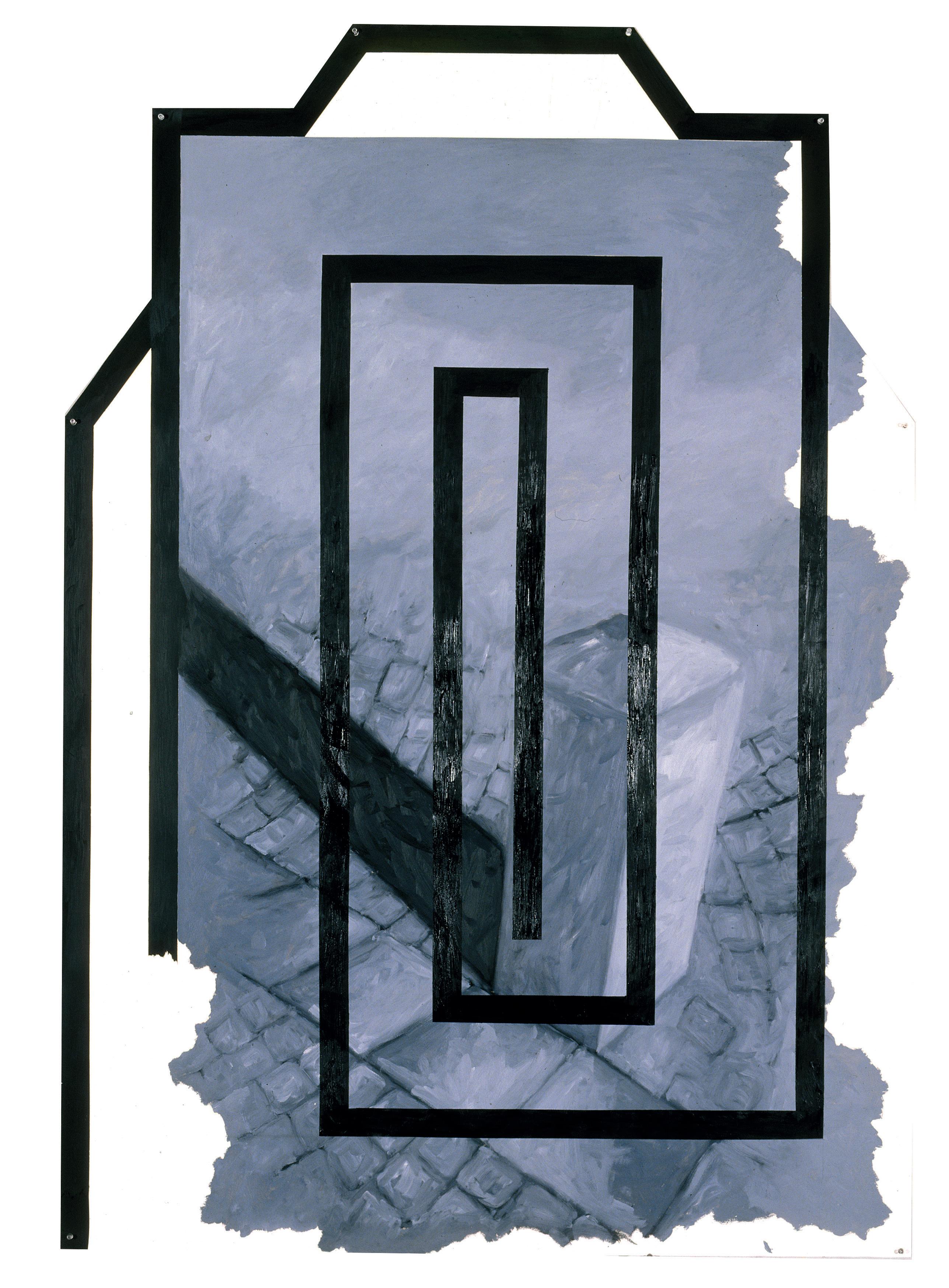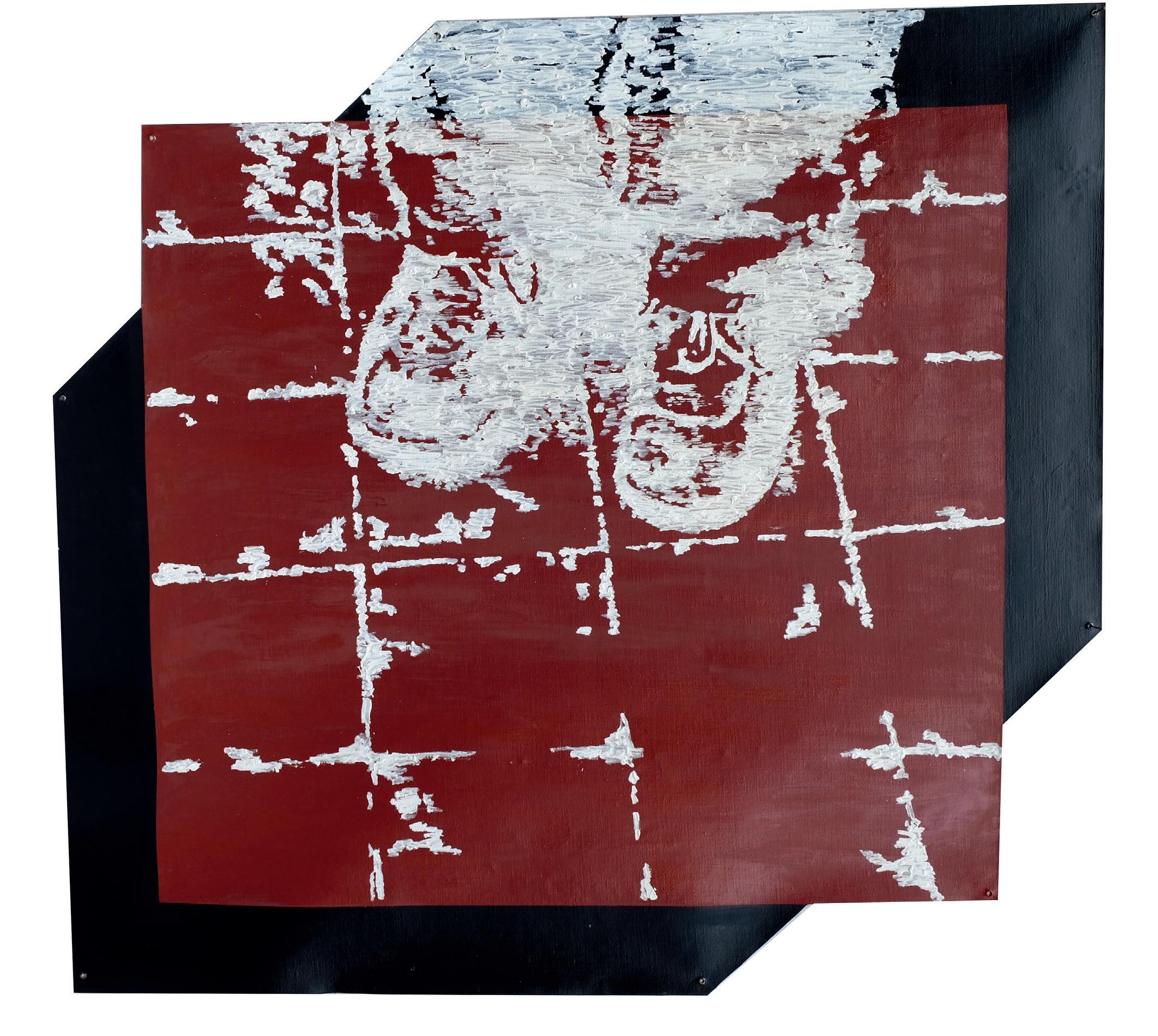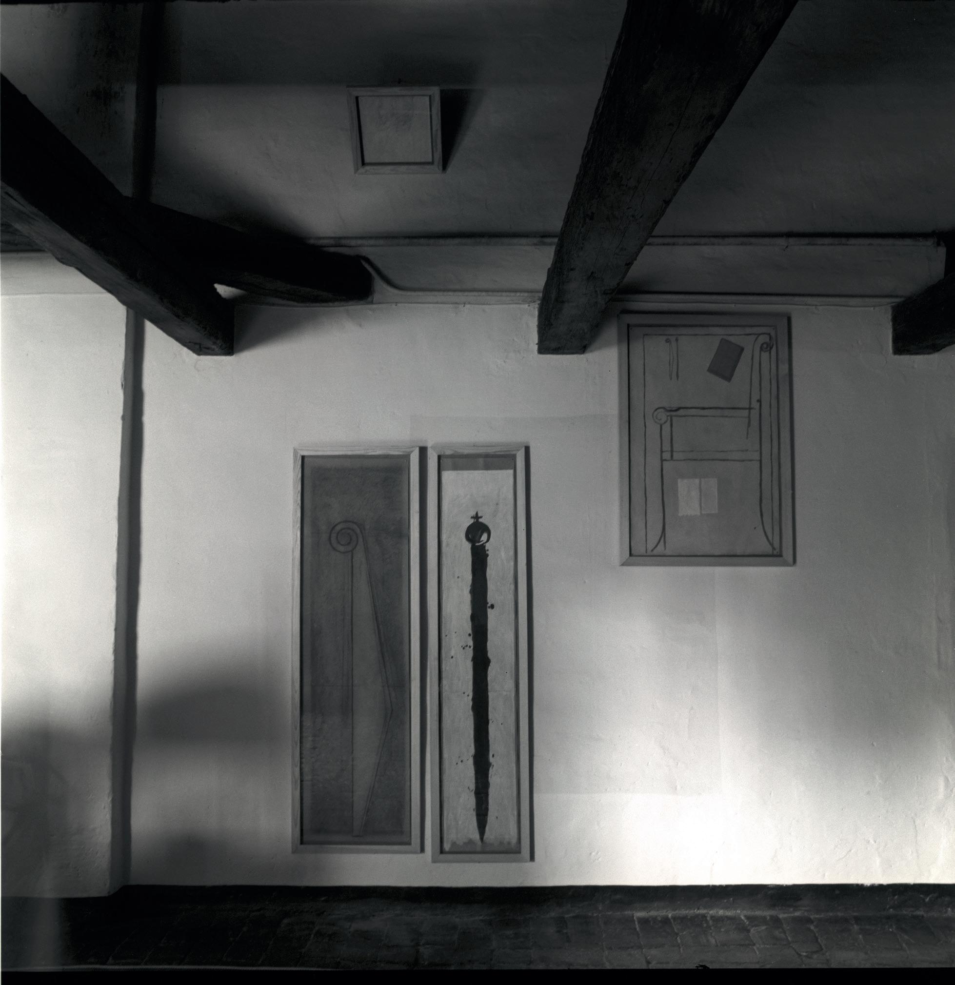 Sans titre, 1988. Pierre de Marne, verre à vin. Pieds, 1985-86. Huile sur bâche, acrylique sur carton. Mnêmê, 1985. Acrylique sur photo et carton. Belgicisme – objets dard, 1988. Casa Frollo, Venezia.