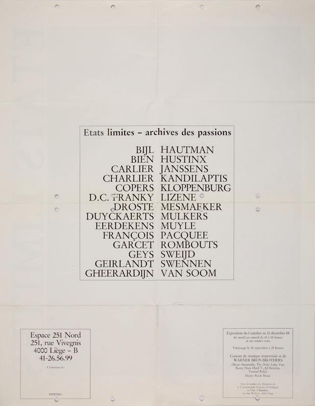 Defrance / Jean Del Cour / Robert Devriendt / Messieurs Delmotte / Jean Dols / Albrecht Dürer / James Ensor / Alain d’Hooghe / Eric Duyckaerts / Robert Filliou / Michel François / Robert Garcet / Pierre Gérard / Jef Geys / Jean-Marie Gheerardijn / Maria Gilissen / Ann Veronica Janssens / Babis