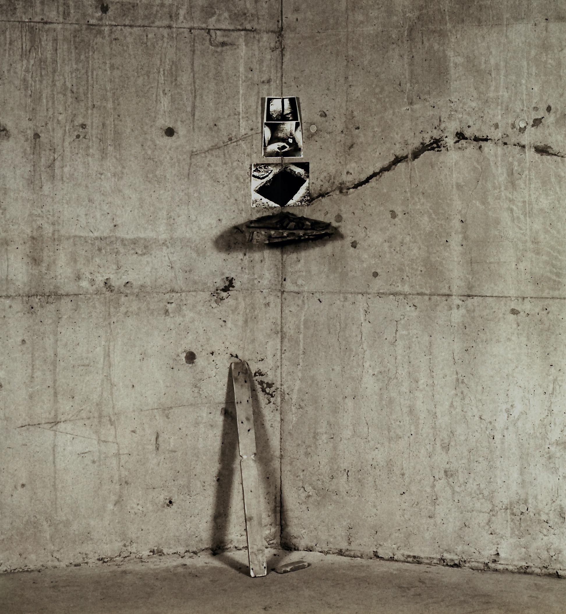 Mnêmê, 1985. Ossements, pierres, bois, photocopies N/B.