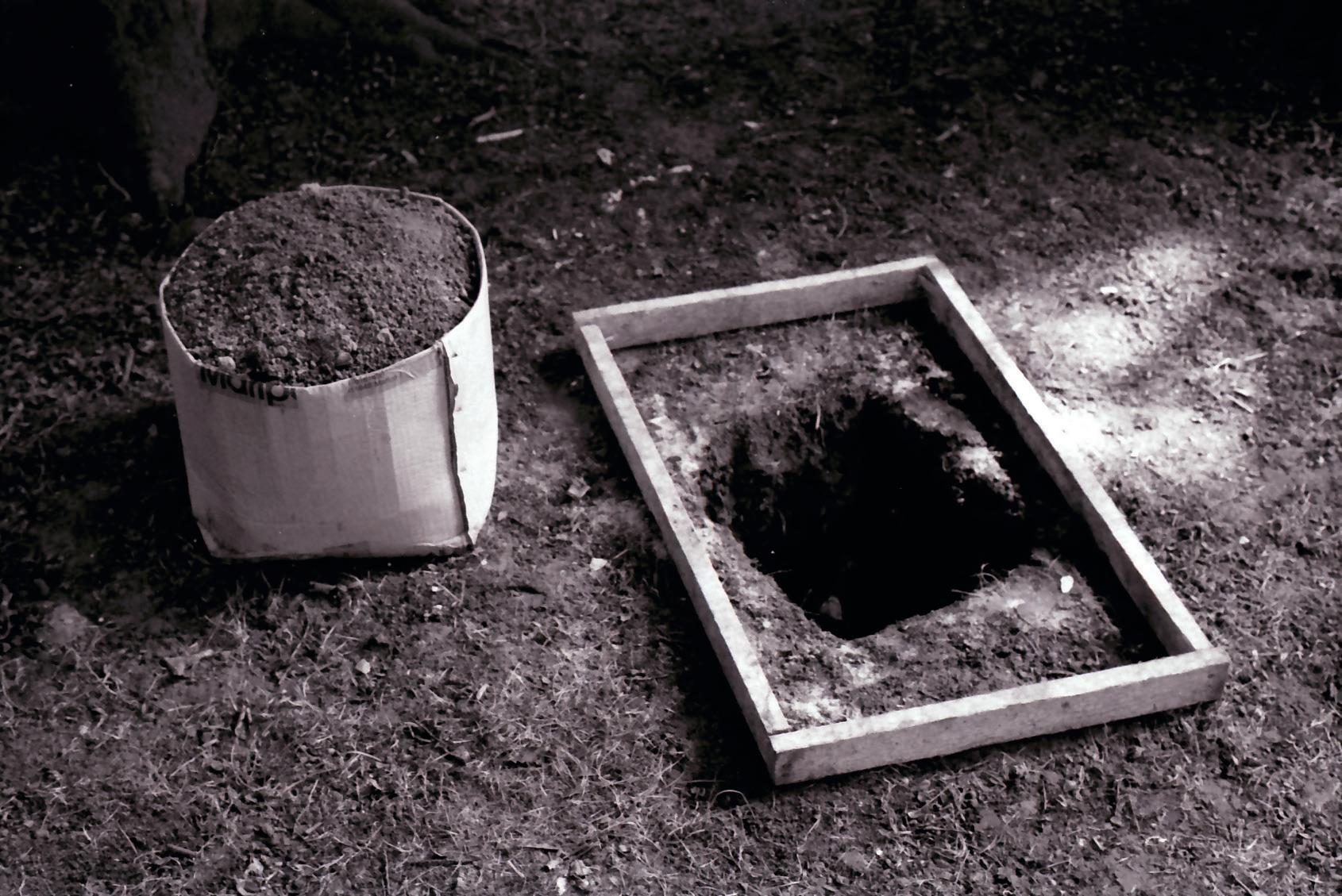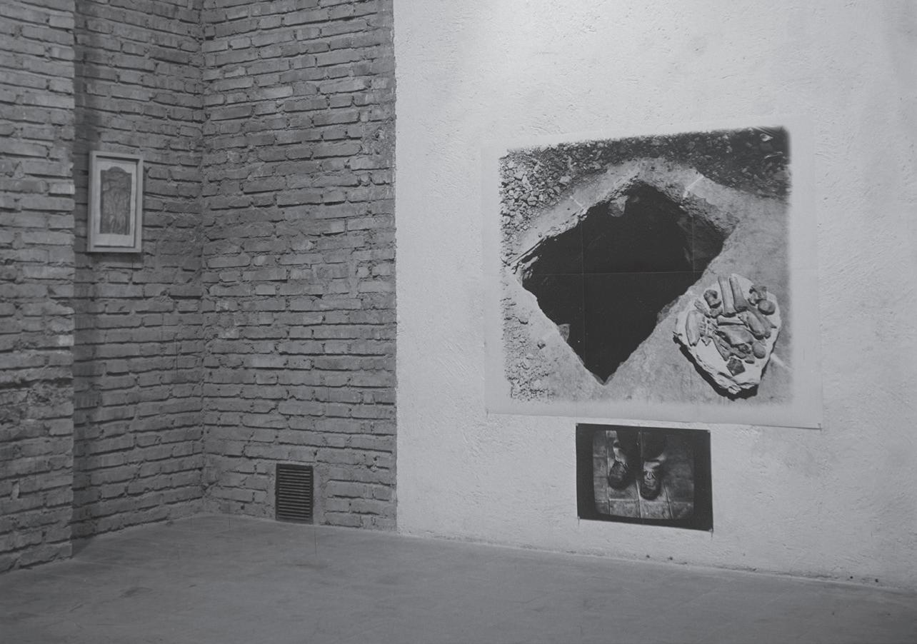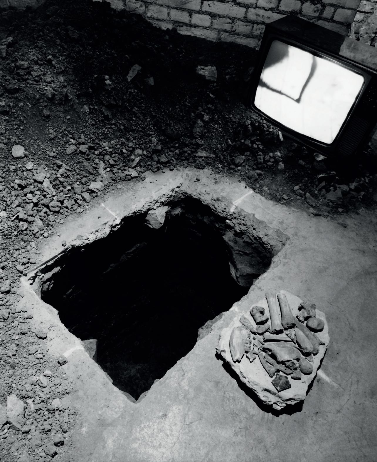 Mnêmê, 1984. Terre, ossements, dessins, vidéo N/B. Nord Investigations, 1984. Espace 251 Nord, Liège.