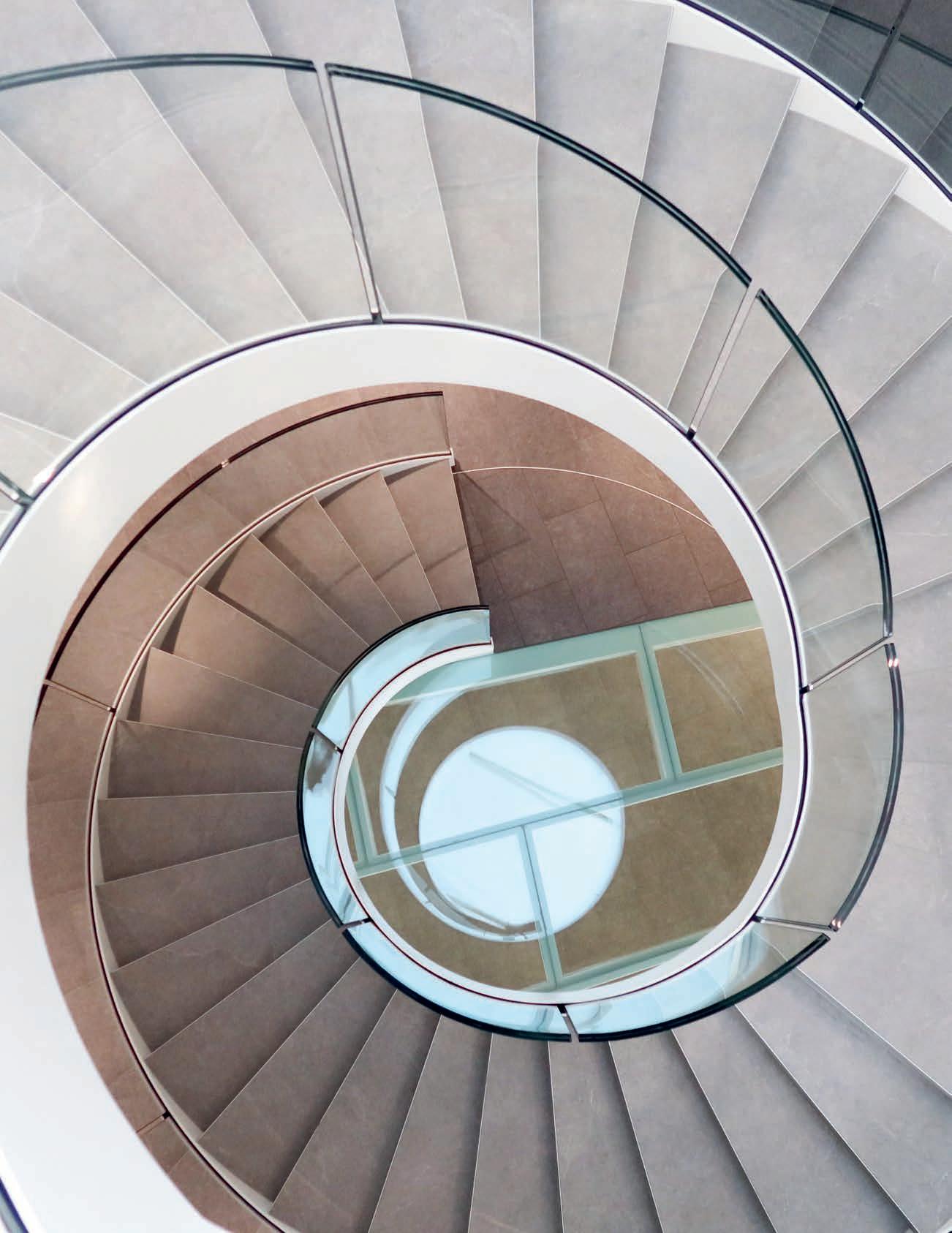 Un escalier hélicoïdal central assure la liaison entre les trois derniers niveaux de l’ouvrage. Il mène aux étages supérieurs sécurisés, réservés uniquement au personnel administratif, →