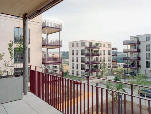 Les quatre constructions distinctes sont constituées de deux bâtiments d’angle, venant encadrer l’espace, et de deux bâtiments isolés qui ferment l’ensemble, atteignant chacun 17 mètres de haut et abritant 5 niveaux. Cette configuration vient renforcer l’idée de quartier, essentielle pour le représentant au maître d’ouvrage, UBS Fund Management, souhaitant créer une dynamique sociale dans cet espace excentré du cœur de la commune. Cela a notamment été possible par deux points majeurs de la construction, comme l’explique Simon Berger, architecte en charge du projet : « La nature joue un rôle important dans ce projet. Elle est en effet omniprésente autour de l’ensemble constructif, mais vient également s’inscrire au cœur des appartements via la construction de loggias en bois. Ainsi, au centre des bâtis nous trouvons un jardin, ou une cour arborée, qui a été pensée comme