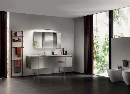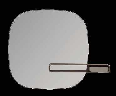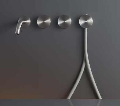 Miroir avec ou sans éclairage dont l’étagère en noyer canaletto peut être accessoirisée de récipients en cuir. giorgettimeda.com Ensemble mural de 2 mitigeurs pour baignoire avec bec et douchette en acier inox, flexible en caoutchouc silicone gris soie. Giotto Plus. ceadesign.it