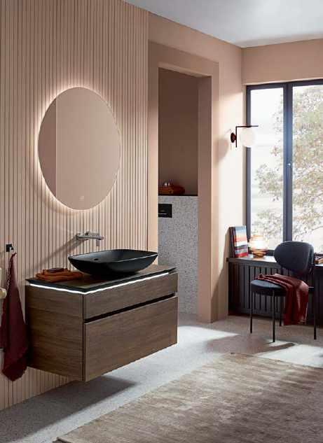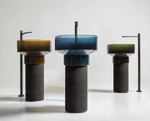 Les vasques de la collection Loop & Friends se déclinent dans un large choix de formes et de couleurs. villeroy-boch.ch La vasque sur pied Borghi se compose d’une base en liège et d’un évier en Cristalmood disponible en plusieurs couleurs. antoniolupi.it