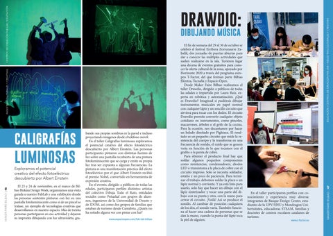 Desde Maker Faire Bilbao realizamos el taller Drawdio, dirigido a públicos de todas las edades e impartido por Laura Ruiz, ex perta en robótica y automatización. ¿Qué es Drawdio? Imaginad si pudiérais dibujar instrumentos musicales en papel normal con cualquier lápiz y un sencillo circuito que sirviera para tocar con los dedos. El circuito Drawdio permite convertir cualquier objeto cotidiano en instrumentos, como pinceles, macarrones, árboles o el grifo de la cocina. Para la ocasión, nos decantamos por hacer un helado diseñado por Pighixxx. El resul tado es un pequeño circuito que mide la re sistencia del cuerpo y la transforma en una frecuencia de sonido, el ruido que se genera varía en función de lo que tocamos con el grafito o la punta de cobre.
