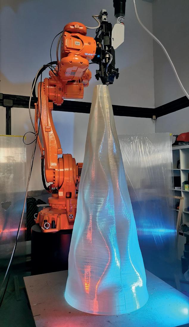 ¿Cómo usar robots en impresión 3D? Gianluca Pugliese es uno de los principales expertos en impresión en gran formato del mundo. Y hace tiempo llevó esa pregunta a la práctica. Se dedica al desarrollo de proyectos con fabricación digital y es el fundador de Low Poly, una empresa de Madrid que trabaja con la impresión 3D enfocada al reciclaje y la reutilización de materiales. Con ella desarrollan líneas de investigación en materiales sostenibles, reciclados y compostables para proyectos innovadores, incluyendo piezas de gran tamaño. A través de su línea Low Impact, desarrollan materiales basados en botellas de plástico recicladas, sobras de café y neumáticos reciclados, entre otros. En su nuevo taller le han dado una vuelta de tuerca al servicio de impresión 3D de piezas pequeñas y medianas, pero están centrados sobre todo en el gran formato. “Tenemos una tecnología única en España”, afirma Gianluca. Para ello, el equipo de Low Poly cuenta con un flamante brazo robótico que permite imprimir piezas grandes haciendo el relleno y el soporte con software sencillo como Cura o Slic3r. Luego, utilizan Grasshopper para diseñar un patrón y crear las instrucciones que permiten la gestión del extrusor y del brazo robótico. “Es un robot que puede trabajar en seis ejes en vez de tres y eso permite muchas posibilidades” explica Gianluca, entre ellas, el light painting, pintura, impresión y textil. Los desafíos pendientes están relacionados con la poca facilidad de uso, una cuestión de software y de interoperabilidad. LA MODIFICACIÓN DE ROBOTS INDUSTRIALES ABRE MIL POSIBILIDADES Low Poly se dedica a rescatar robots industriales y mecánicos descatalogados de todo tipo de fábricas para reciclarlos y generar nuevas posibilidades gracias a la segunda mano. Actualmente, los robots que se emplean para fabricación digital pertenecen a cuatro marcas: ABB, KUKA, FANUC y Universal Robots. “Podemos desarrollar un software que se adapte a esas marcas y a los modelos más comunes”, explica Gianluca.