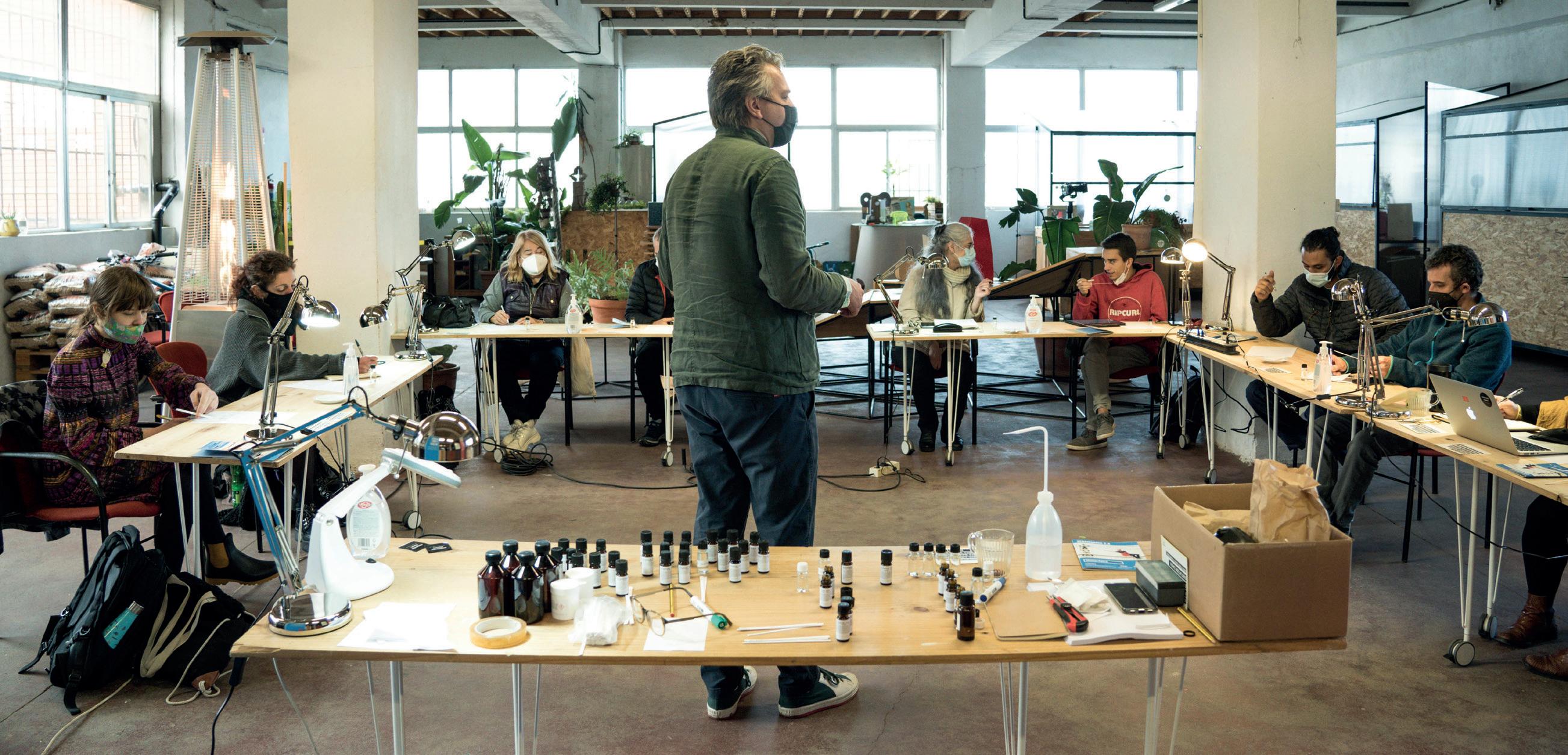 Este odorama curator enseñó a los y las asistentes del taller a diseñar aromas con metodologías abiertas y, finalmente, a crear de forma colectiva un perfume que refleja la ciudad de Bilbao. Tras unas nociones básicas en la materia, el profesor y sus aprendices salieron a realizar una investigación sobre el terreno en la isla de Zorrozaurre para buscar inspiración sobre el aroma de nuestra villa. Recorrieron la zona industrial y volvieron con varios elementos que combinaron en una bella instalación con musgo, ladrillos, madera y clavos. “Es el olor que surge cuando el río y el mar se unen en una zona con fábricas y humo, la esencia del hierro pero también del vino, sin olvidar que nos encontramos en una antigua fábrica de galletas”, describe Frank. Ahora que Bilbao ha dejado atrás ese gris pasado industrial, él considera que debe reinventar su olor. “Hay un ambiente inodoro, así que ese vacío debe llenarse con otros olores”, considera. UN TALLER PARA LA CREACIÓN PERSONALIZADA DE ESENCIAS El taller comenzó con una pequeña introducción sobre el arte de los olores, una disciplina relativamente nueva. Hace unos doscientos años la gente empezó a usar perfumes, ya que antes llevaban guantes de cuero aromatizados hechos en España o Rusia, pero cada país tenía sus matices. La tendencia cambió en el siglo XIX en Francia, cuando empezaron a usarse aceites destilados de diversas plantas, sobre todo cítricas, a través de su piel.