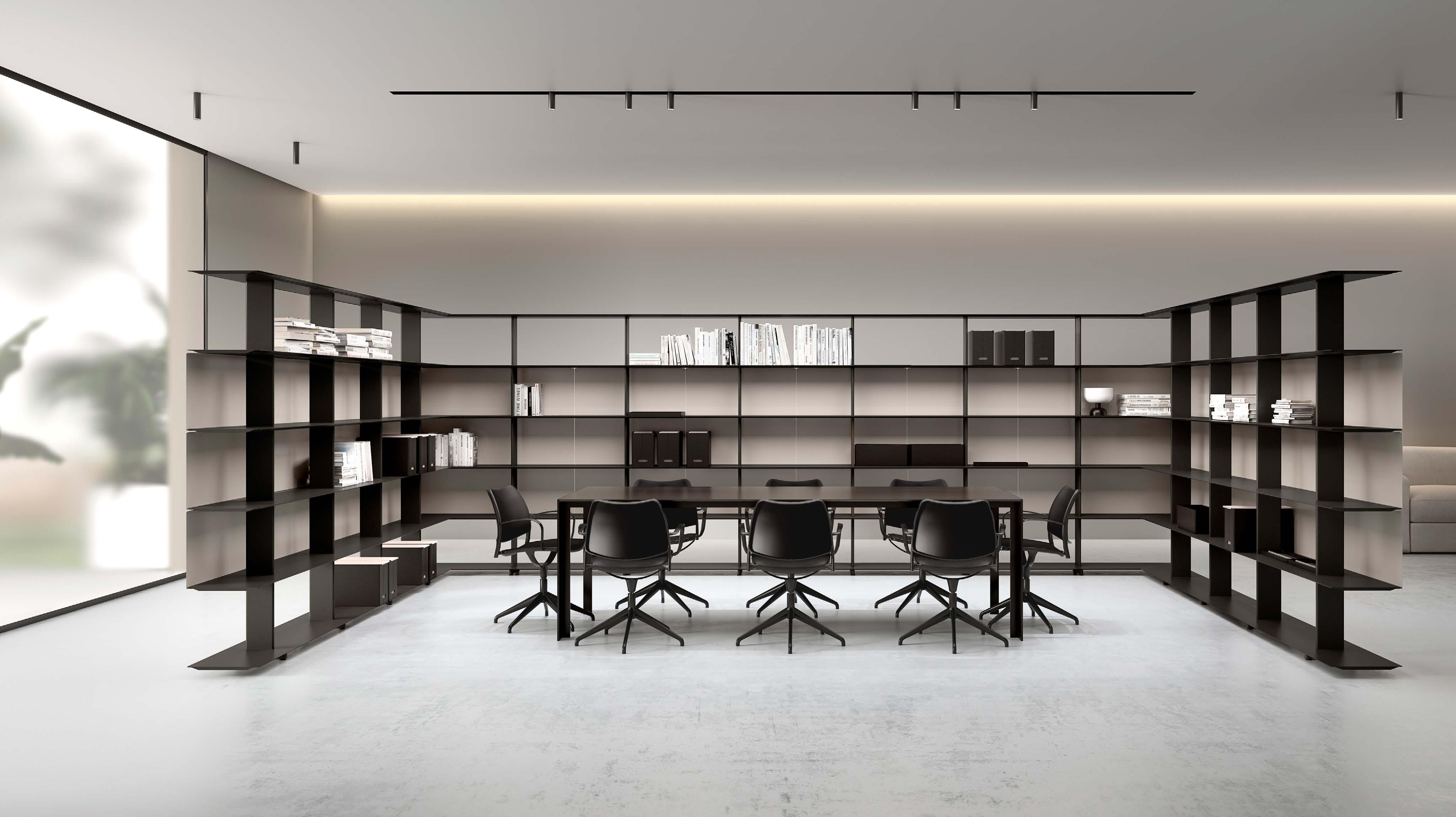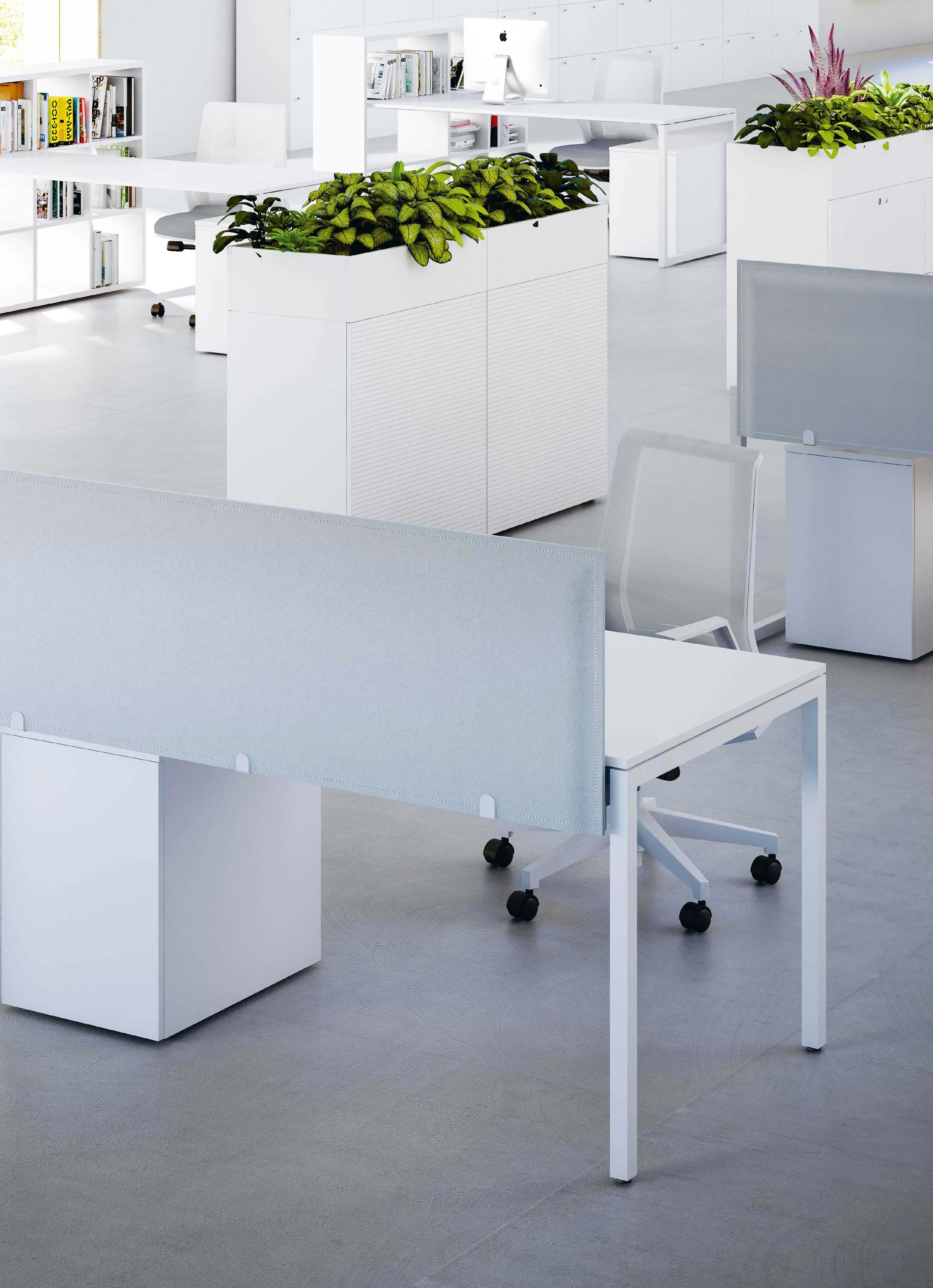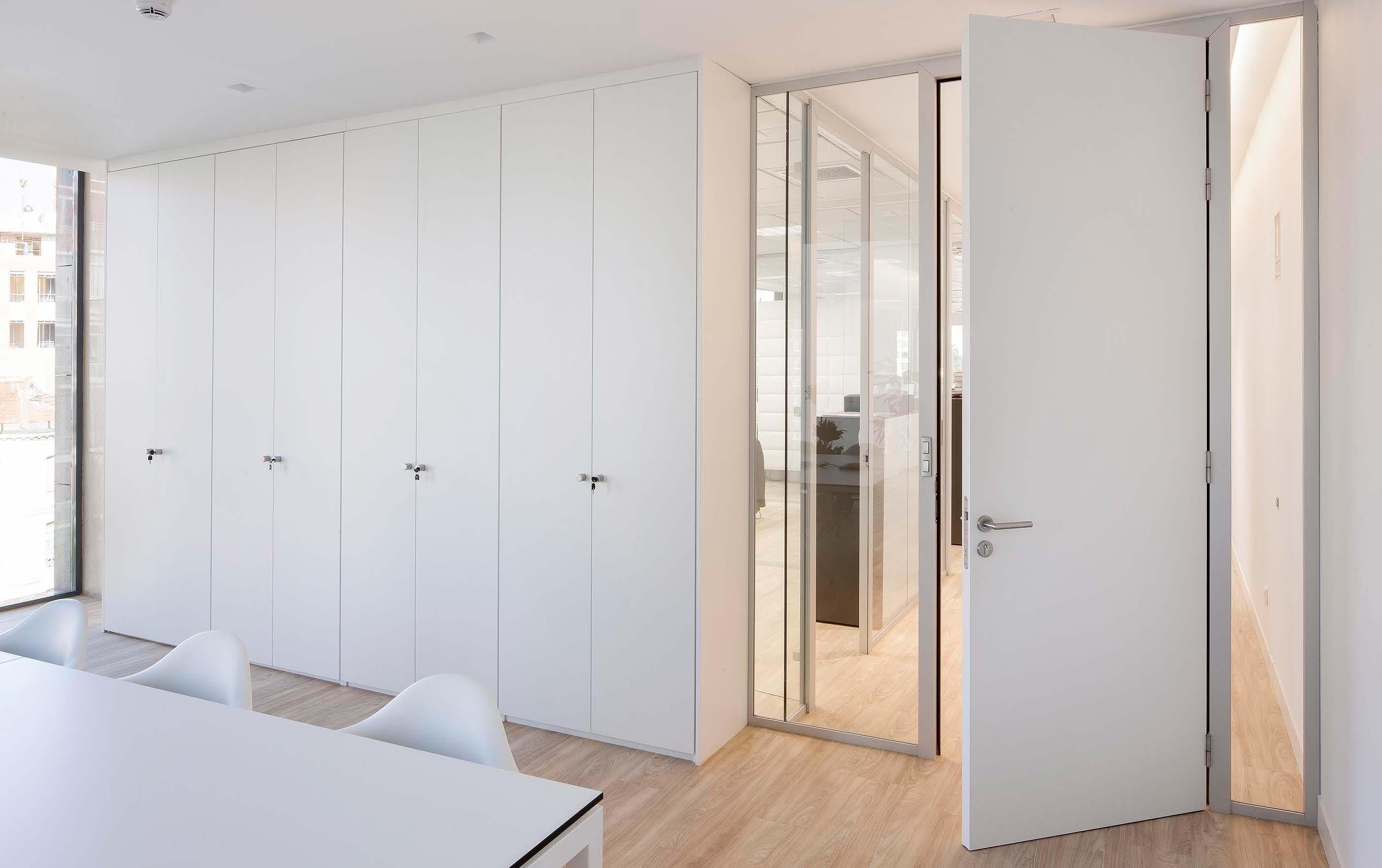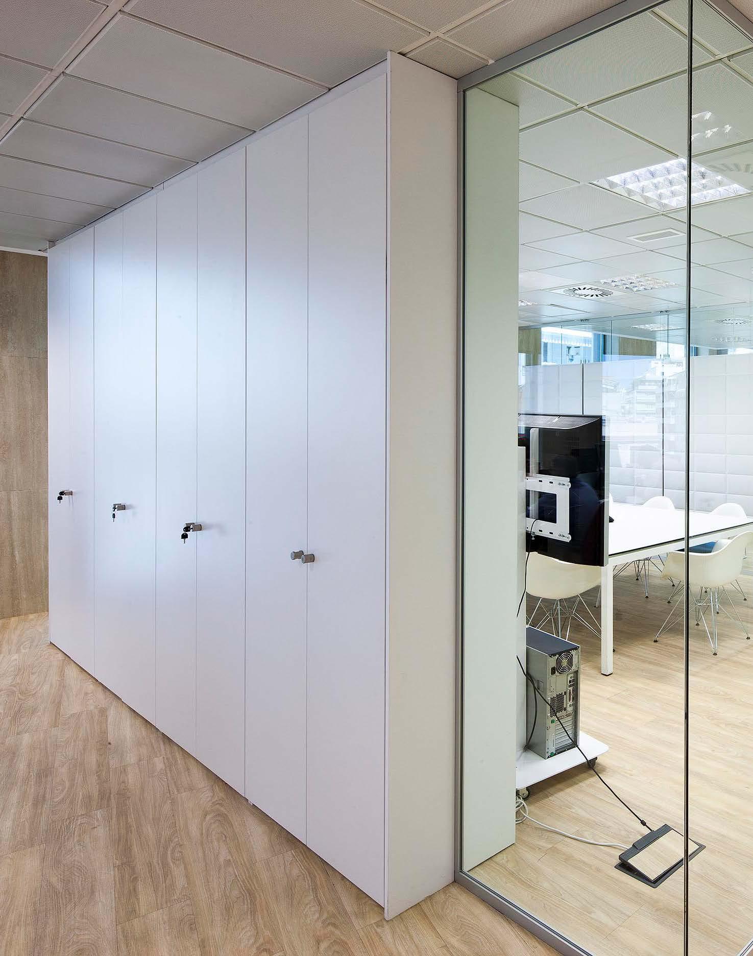 Complementos y elementos que no solo actúan como archivo, sino también organizan el espacio, aportan diseño y contribuyen a la imagen corporativa. Véase la integración del archivo con las mamparas divisorias, constituyendo en sí mismo un elemento arquitectónico.