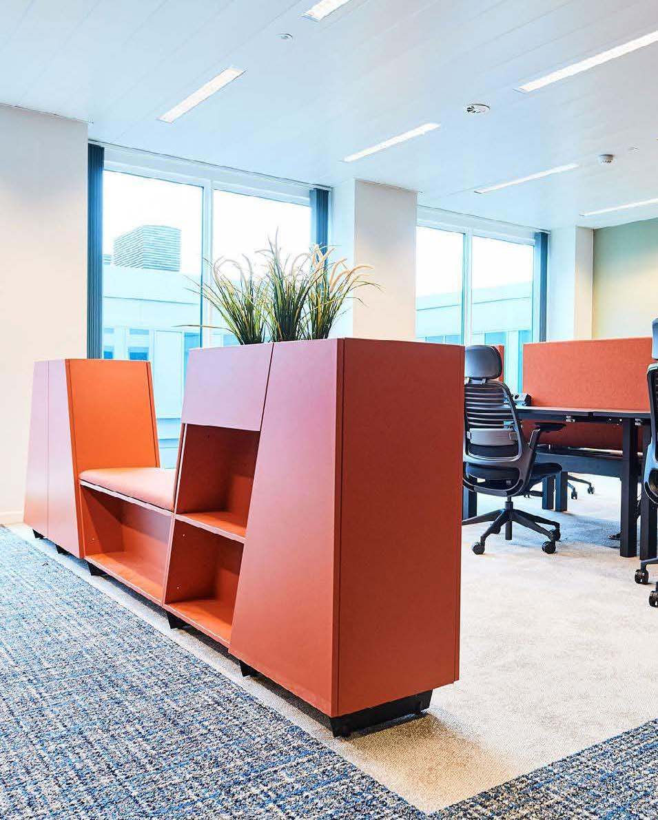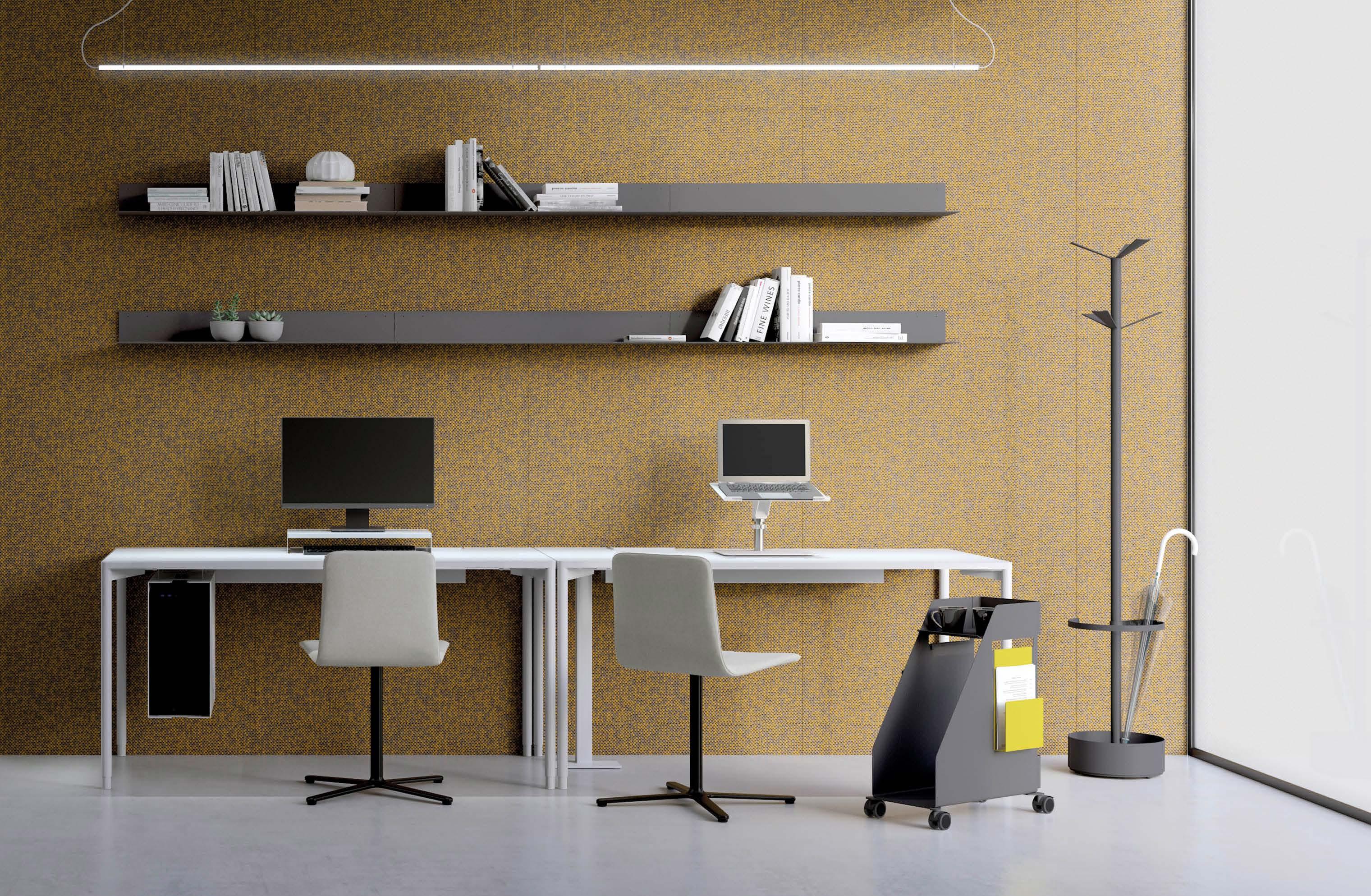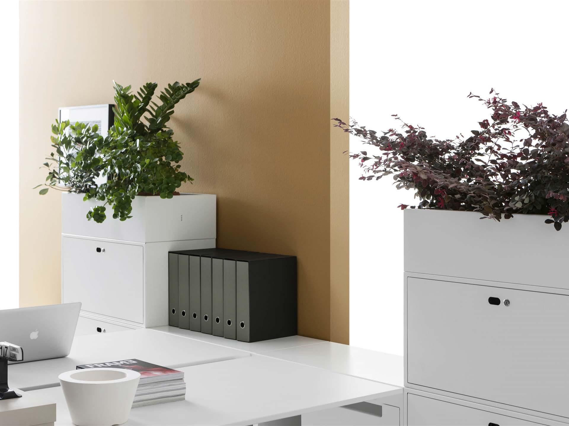Complementos y elementos que no solo actúan como archivo, sino también organizan el espacio, aportan diseño y contribuyen a la imagen corporativa. Véase la integración del archivo con las mamparas divisorias, constituyendo en sí mismo un elemento arquitectónico.