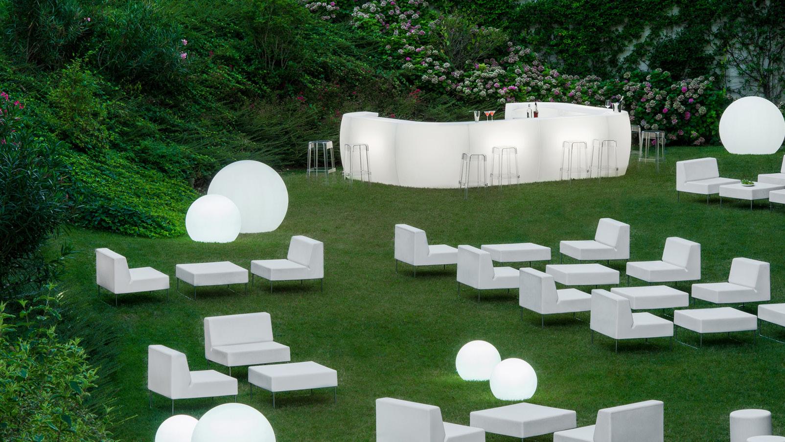 Barra retroiluminada Igloo & taburetes Rubik & Asientos modulares Host & Poufs Wow