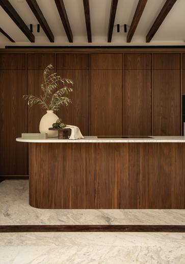 Las cocinas son de nuestra marca propia Cocinart, modelo C1, con frontales de chapado de nogal y medias cañas; y encimeras de piedra Gris Zarci.