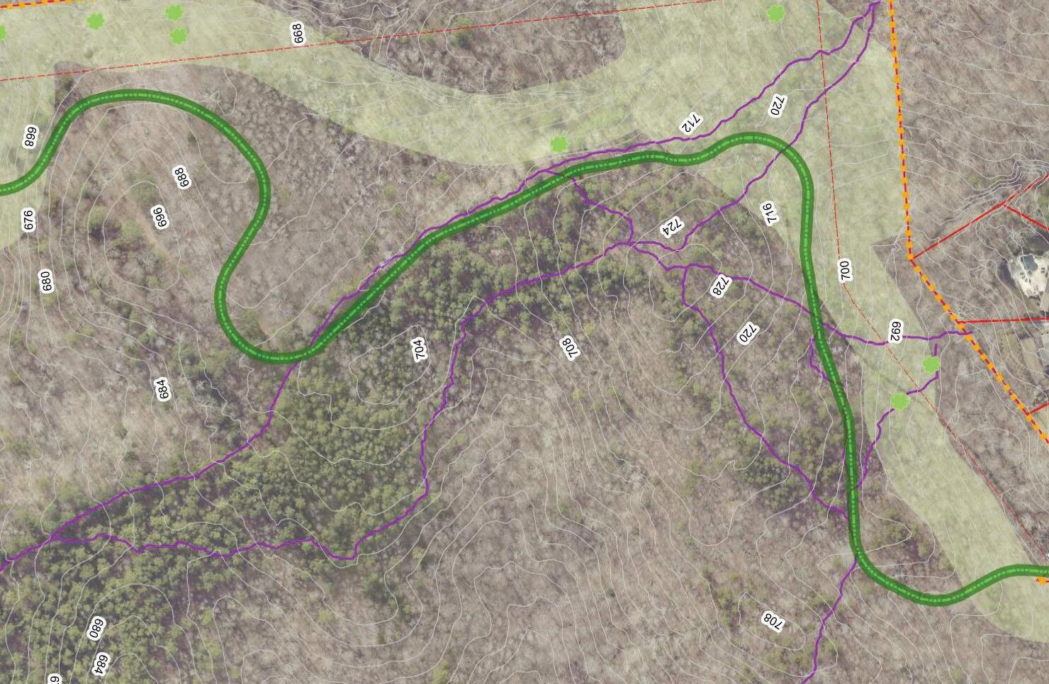 Survey & Easements: Our team conducted surveys in the areas around the trail to assist with placement of the trail network around existing topography and trees. Also included were easement plats with metes and bounds descriptions throughout five properties.