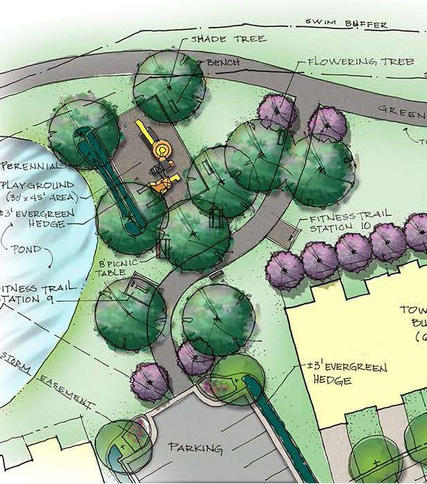 Design Features: Creating viewpoints of the stream, ESP designed the hard-surface trail to wind through natural areas along the stream banks. Our team also designed the trailhead as well as additional parking areas for public access at four of the ten fitness stations along the trail.