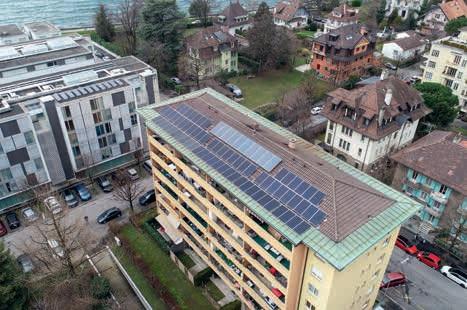 les locataires sont régulièrement informés de la part d’électricité produite sur le site qu’ils utilisent. Une application informa tique permet d’actualiser ces valeurs tous les quarts d’heure, ce qui permet à chacun d’adapter sa consommation et donc privilé gier l’usage de l’énergie solaire, en faisant fonctionner certains appareils (comme p. ex. les machines à laver) durant les périodes en soleillées. Dans le cas présent, le système combinant panneaux photovoltaïques et RGD est d’autant plus intéressant que les équipements ont tous bénéficié de subven tions de la Confédération et de la commune de Vevey.