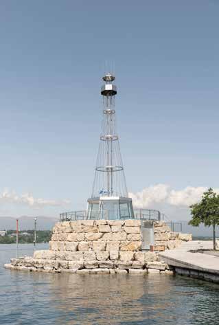 Le parti pris de l’anti-monument permet de répondre aux enjeux patrimoniaux du site de la Rade, relevés par l’OPS, et pour lequel Bureau a dû produire plusieurs images depuis les lieux publics et le lac. Cette stratégie de la discrétion se met ici en œuvre par mimétisme. D’une part, le choix des enrochements pour la base, qui s’apparentent au matériau utilisé pour les digues des phares déjà existants des Pâquis et des EauxVives. D’autre part, le choix d’une structure métallique légère et élancée qui se confond avec les mâts des bateaux du port, et qui culmine à 21 m, à la hauteur de corniche des bâtiments du quai des Eaux-Vives.