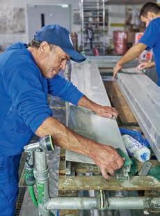 camouflés dans la même teinte. Les nouveaux cadres, double vitrages et panneaux Thermolux, intégrés dans la profondeur du profil, assurent à la façade une performance thermique efficace sans rien ôter de la finesse de son dessin d’origine ; quant à la finition peau d’orange à la surface des verres, elle permet d’éviter les reflets extérieurs et l’éblouis