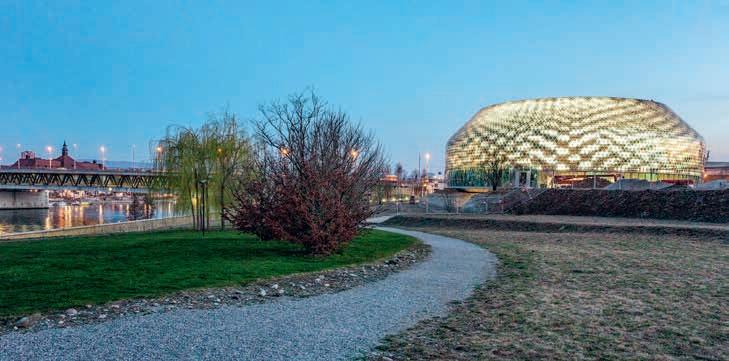 La façade en liège du nouveau bâtiment d’exploitation du complexe sportif « Stade des Arbères » (p. 34) à Meyrin (GE) respecte les principes de l’écoconstruction formulés par le maître d’ouvrage.