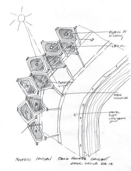 von unten in die Medienfassade des «Novartis Pavillon» (vgl. S. 38). Die insgesamt über 10 000 rautenförmigen Photovoltaikmodule und die darin verbauten LEDs sorgen für ein künstlerisches Lichtspiel. La façade médiatique du « Pavillon Novartis » vue du dessous (p. 38). Les plus de 10 000 modules photovoltaïques en forme de losange et les LED qui y sont intégrées créent un jeu de lumière artistique. Vista dal basso della facciata spettacolare interattiva del «Padiglione Novartis» (cfr. p. 38). Gli oltre 10 000 moduli fotovoltaici romboidali e i LED installati creano un gioco di luci artistico.