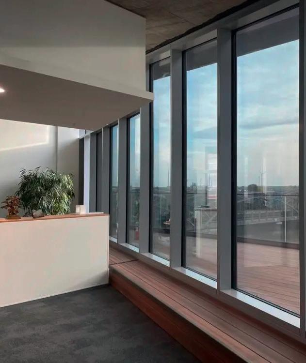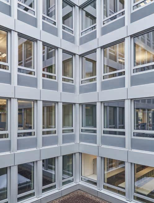 neusten technischen Standard zu entsprechen, erhält die Fassade einen neuen Aufbau, bestehend aus einer Element fassade aus CircalAluminium sowie rund 3000 m2 gross formatigen Scheiben aus dem Sonnenschutzglas eyrise s350. Dieses lässt sich dank Flüssigkristalltechnologie auf Knopfdruck dynamisch verdunkeln, was eine übermässige Erhitzung der Innenräume verhindert und gleichzeitig den Verzicht auf einen Sonnen, Sicht und Blendschutz ermöglicht. Dies spart wiederum Material und Betriebsaufwände. Insgesamt 1082 Fassadenelemente wurden montiert. PVAnlagen auf dem Dach und ein Anschluss ans Fernwärmenetz ergänzen das Nachhaltigkeitskonzept. (js)