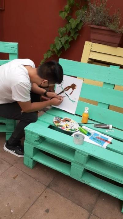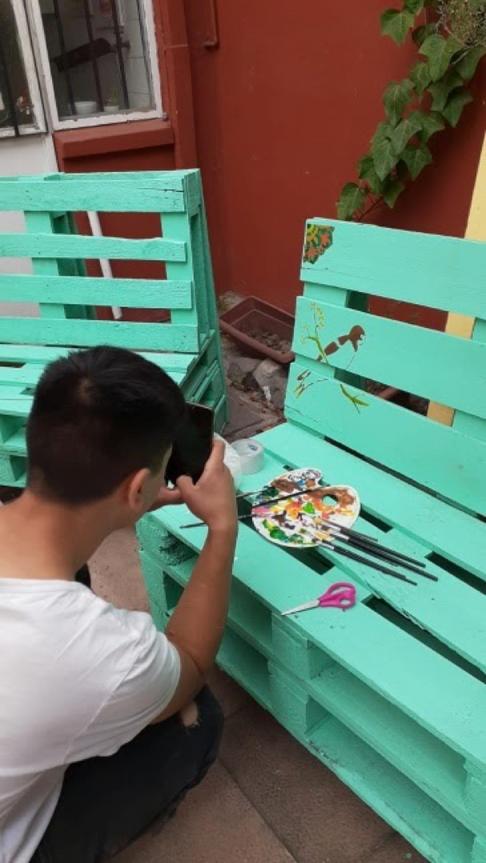 Se construyó cada banca con pallets usados, y fueron decorados entre todos los jóvenes, integrando a profesionales del programa. Los espacios al aire libre fueron reacondicionados, principalmente productos de la pandemia por COVID-19, convirtiéndose en una actividad que fortaleció el vínculo para el tratamiento terapéutico