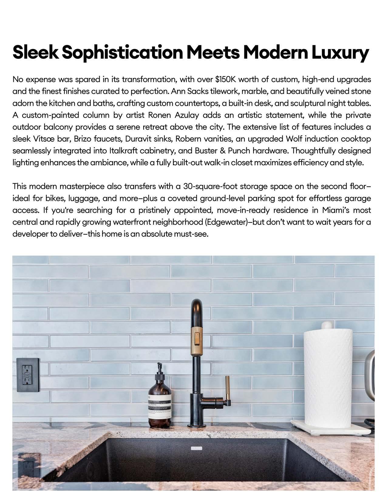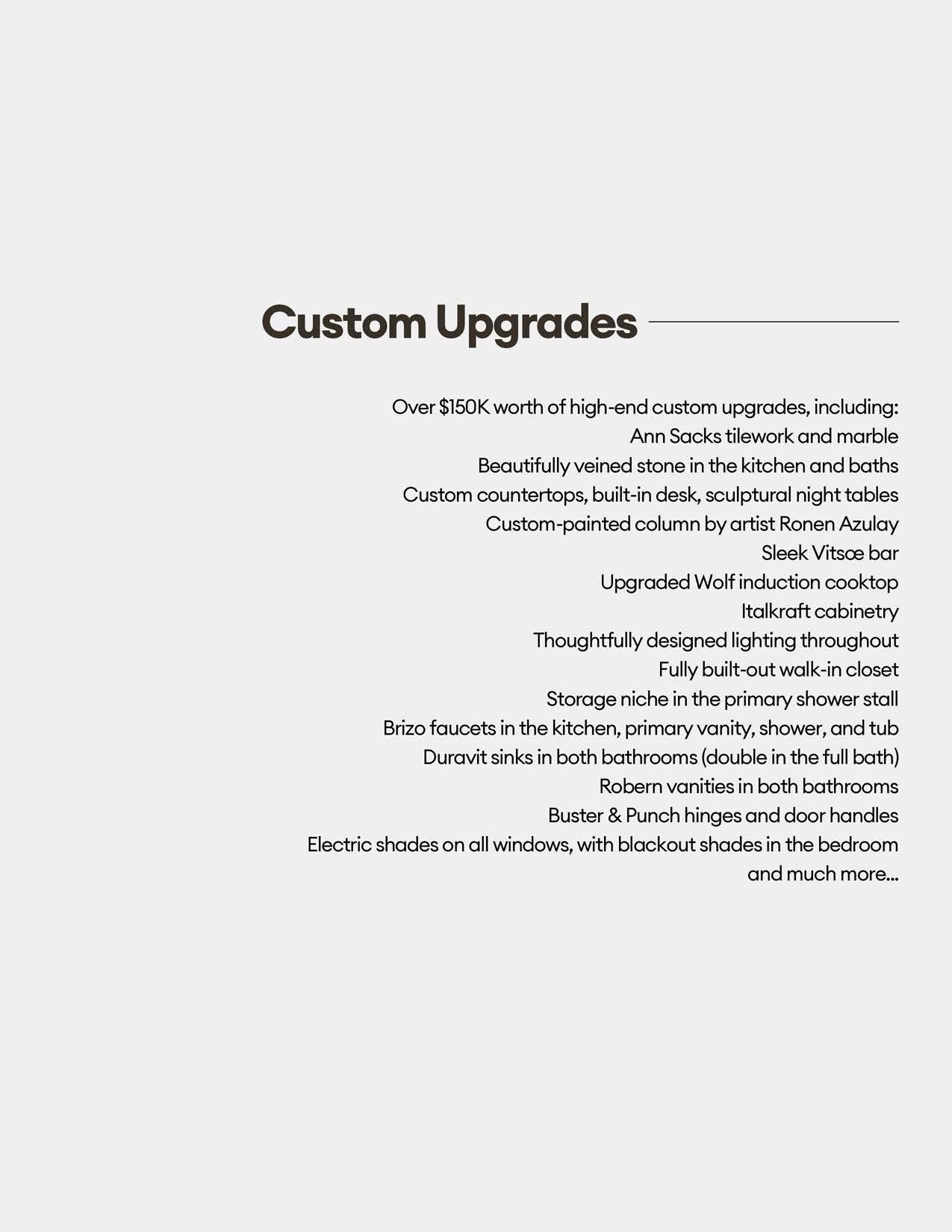 Custom upgrades: Ann Sacks tilework, marble, and beautifully veined stone in the kitchen and baths, custom countertops, built-in desk, sculptural night tables, custom-painted column by artist Ronen Azulay, sleek Vitsœ bar, upgraded Wolf induction cooktop seamlessly integrated into countertop, Italkraft cabinetry, thoughtfully designed lighting throughout, fully built-out walk-in closet, storage niche in the primary shower stall, Brizo faucets in the kitchen, primary vanity, shower, and tub, Duravit sinks in both bathrooms (double in the full bath), Robern vanities in both bathrooms, Buster & Punch hinges and door handles.