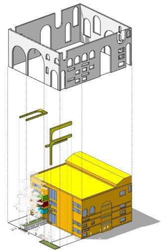 The horizontal and vertical elements between the façade shell and the main building enhance visual aesthetics, structural support, and offer shading.