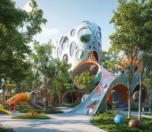 This protruding skin façade creates depth and maximizes space, offer a dynamic visual experience with shifting shadows and changing color tones as the sun moves.It ensures natural light and air circulation, captivating both children and adults, the primary users.